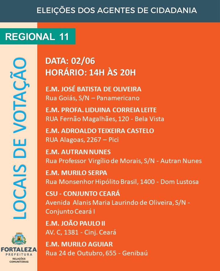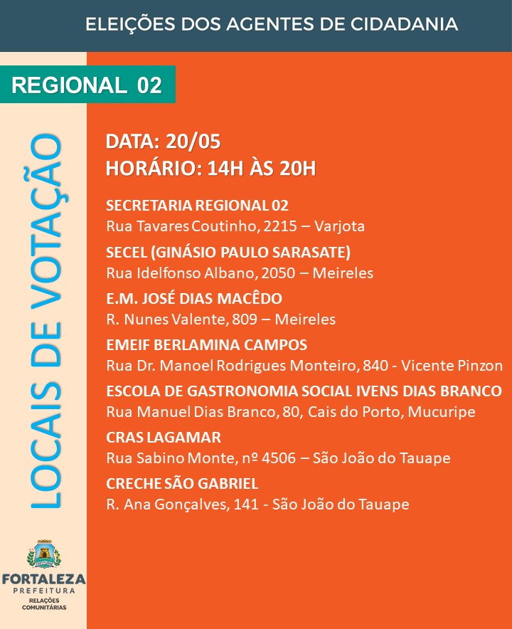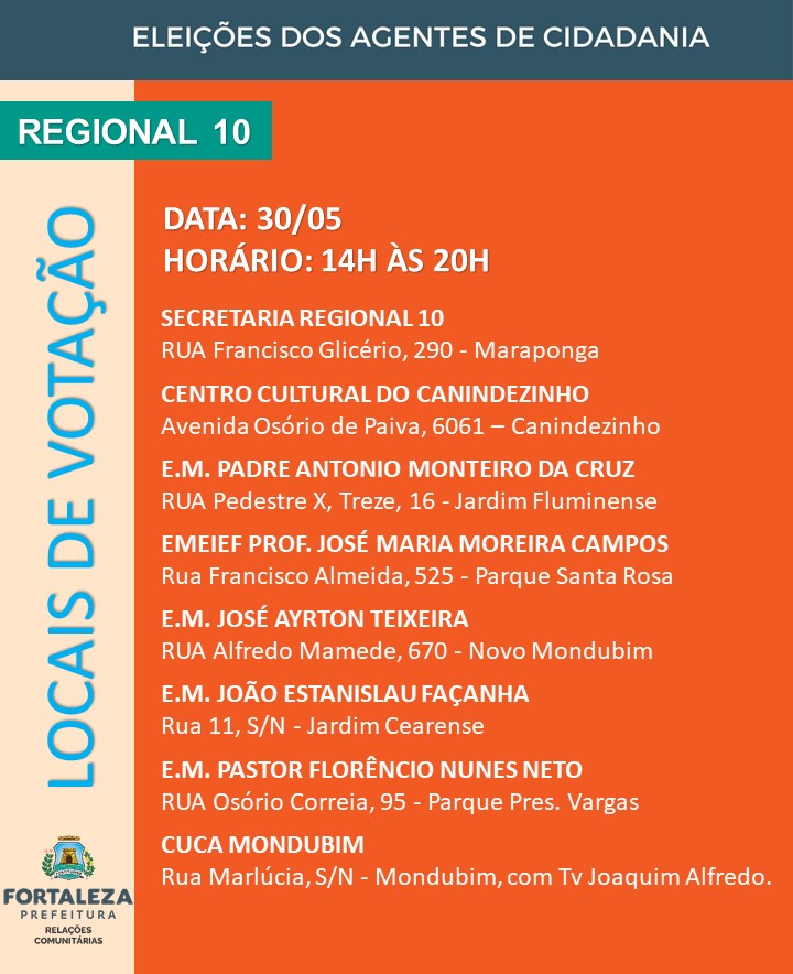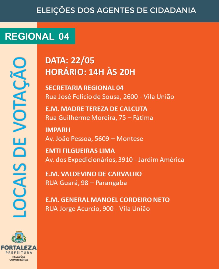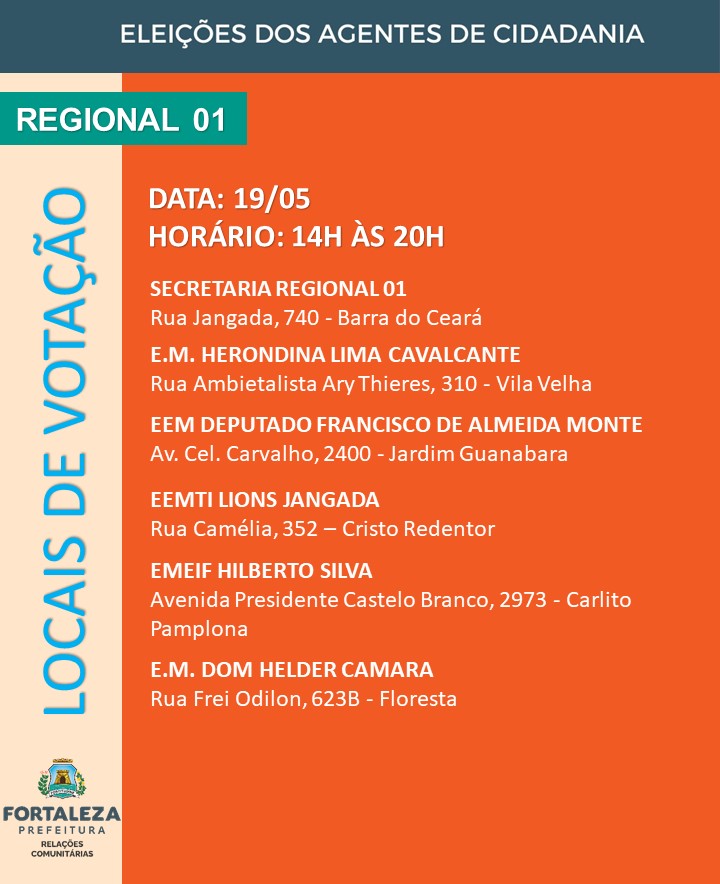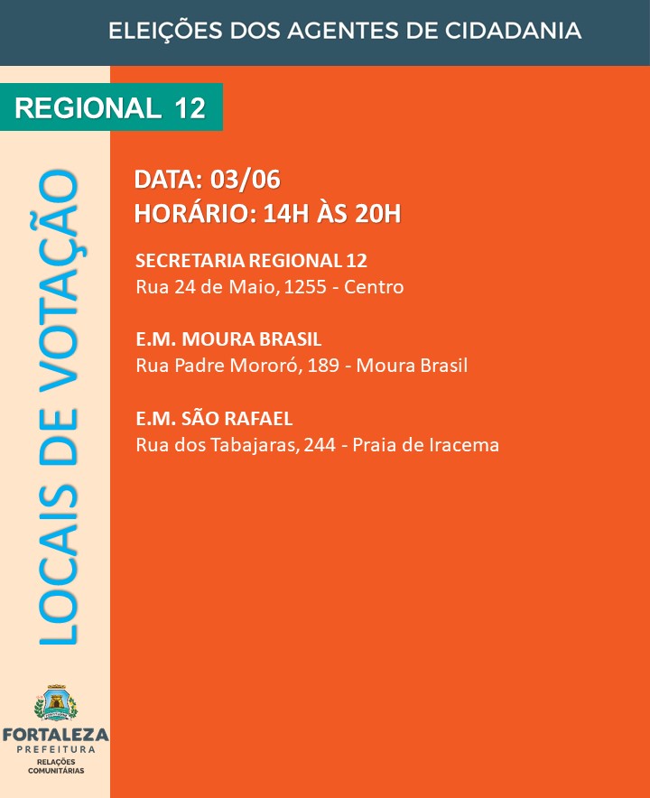 A Prefeitura de Fortaleza, por meio da Secretaria Municipal de Relações Comunitárias (Serc), realizará, entre os dias 19 de maio a 03 de junho, a eleição para Agentes de Cidadania e Controle Social (ACCS), biênio 2025/2026.