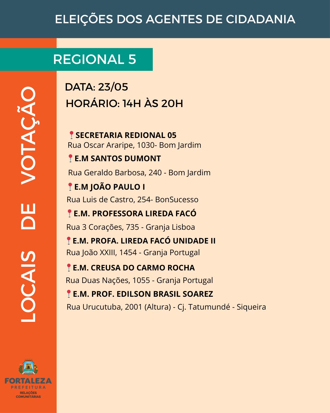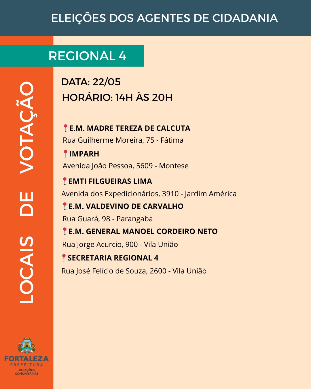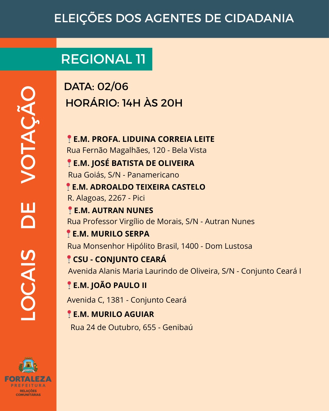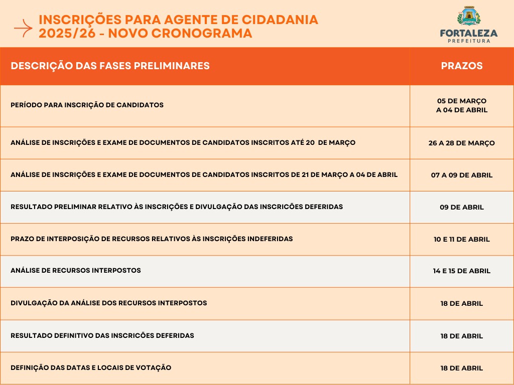 A Prefeitura de Fortaleza informa a retificação da lista final de candidatos publicada em 18 de abril de 2025, referente às inscrições deferidas para a eleição dos Agentes de Cidadania e Controle Social.