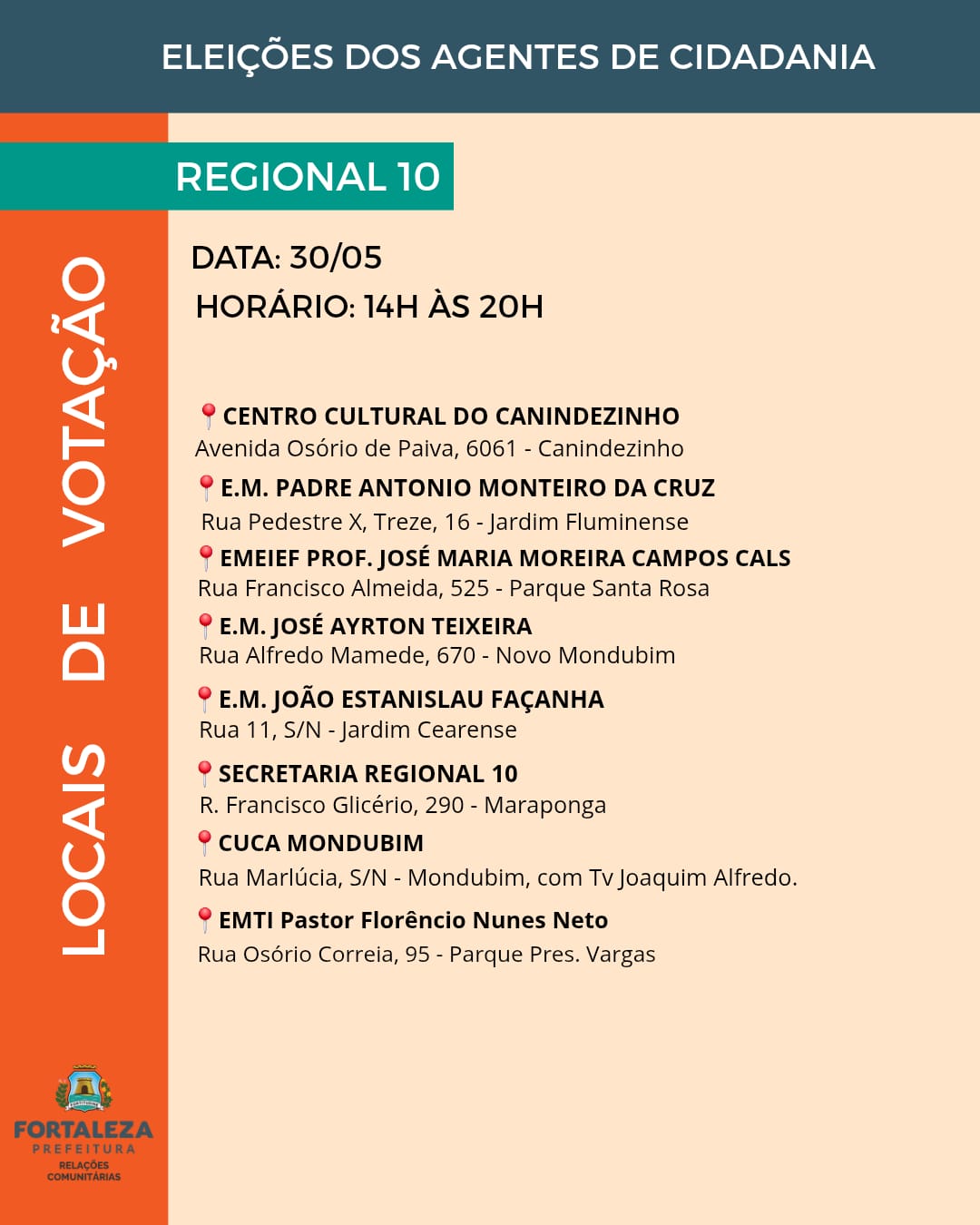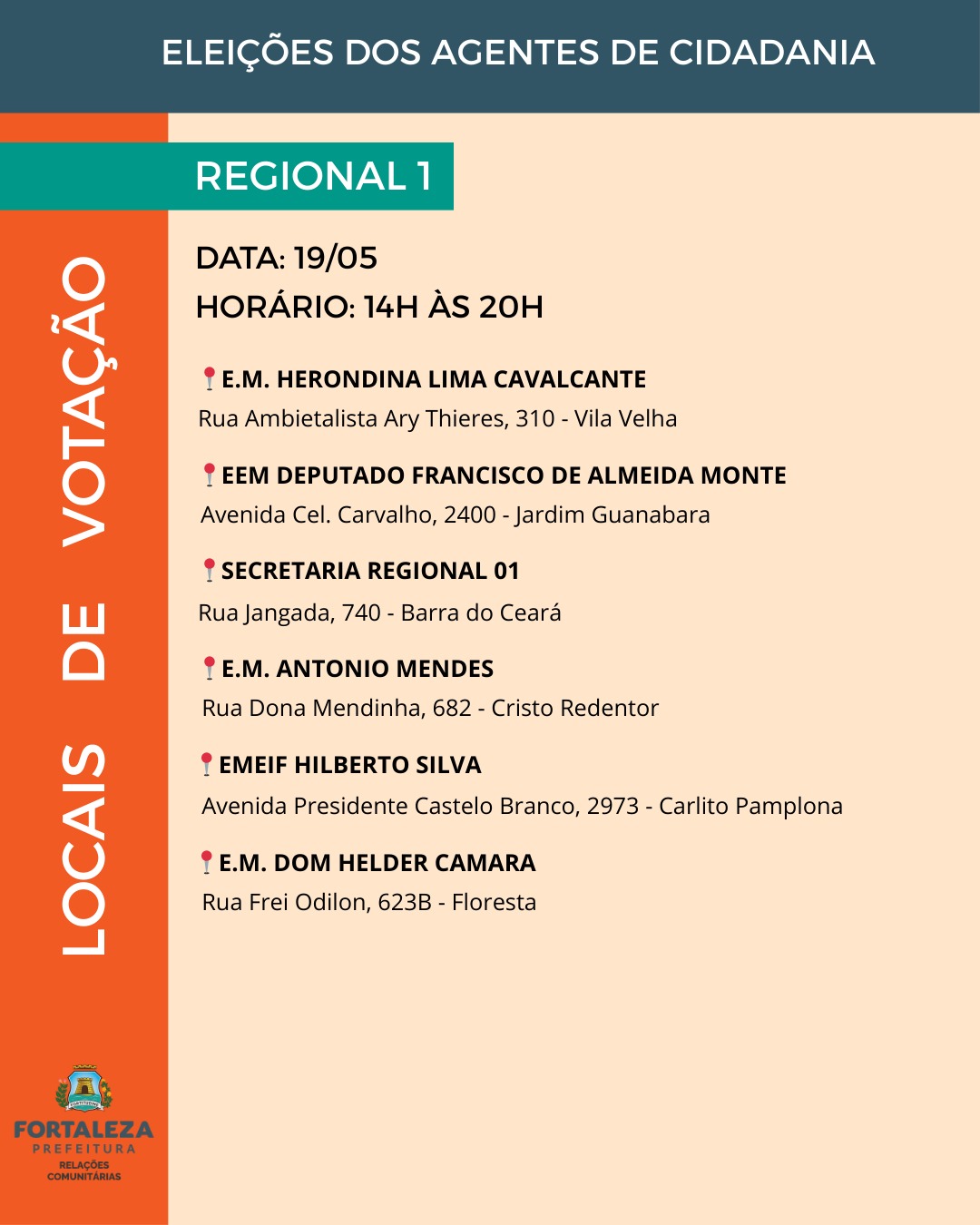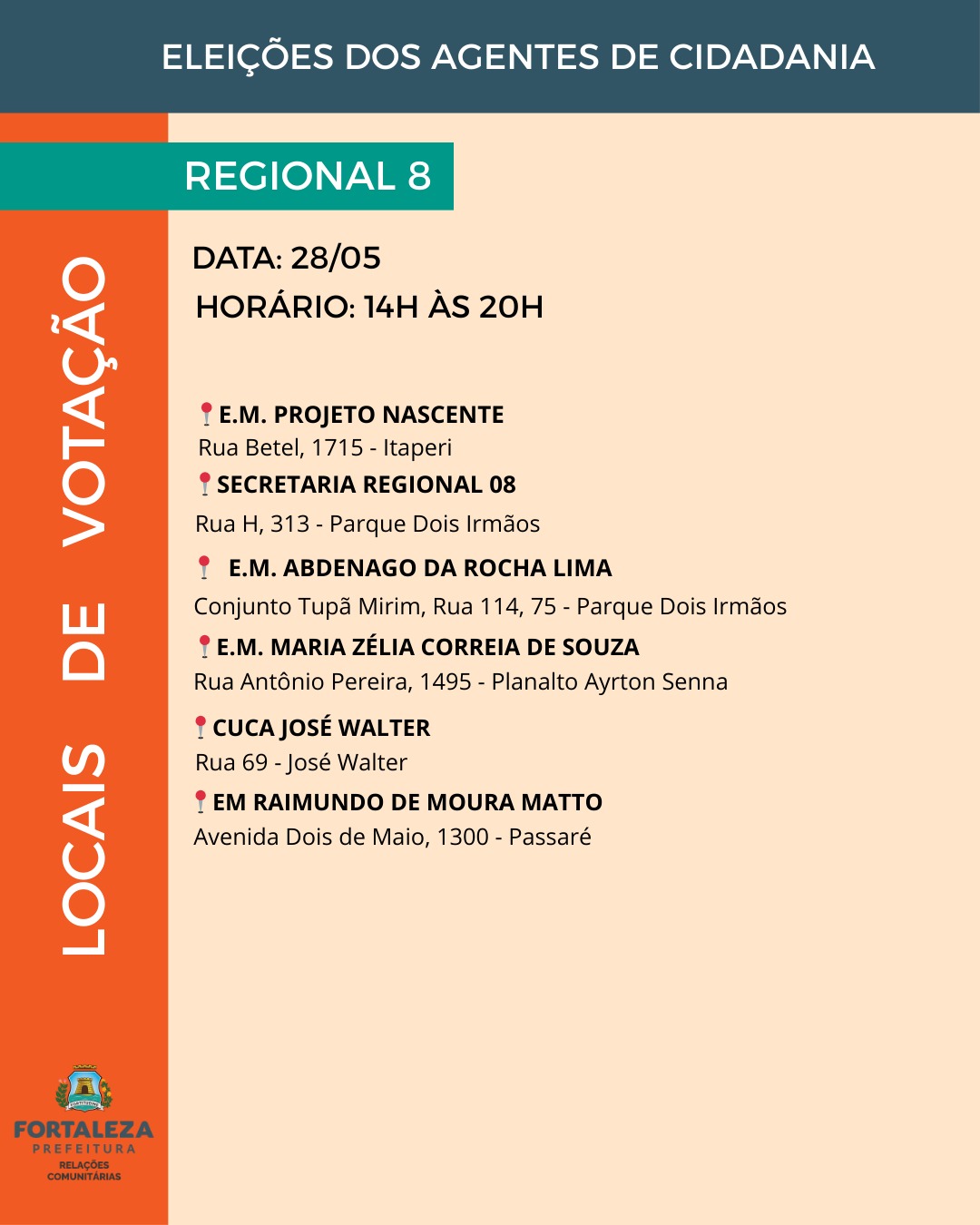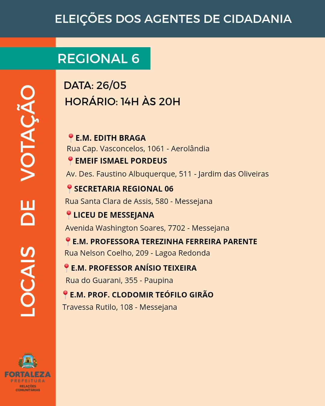 As vagas para agentes de cidadania estão distribuídas entre os 121 bairros e os 39 territórios da cidade, abrangendo as 12 Regionais de Fortaleza. A quantidade de representantes é definida com base na proporcionalidade populacional, garantindo a eleição de um agente para cada grupo de cinco mil habitantes, conforme os dados do Instituto Brasileiro de Geografia e Estatística (IBGE).
