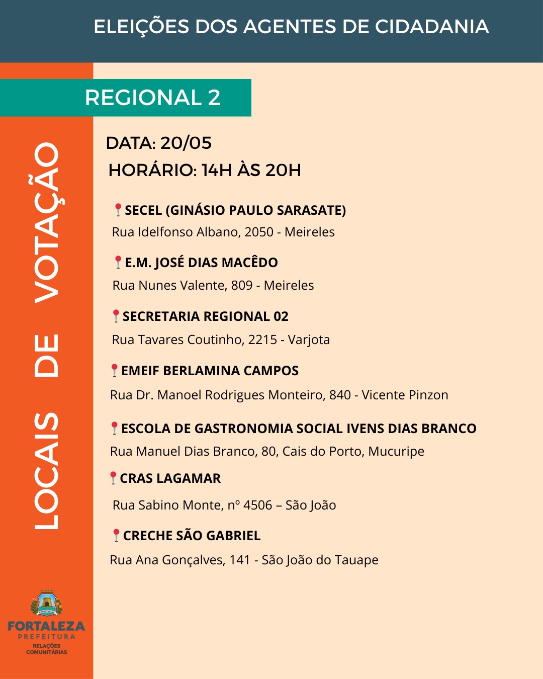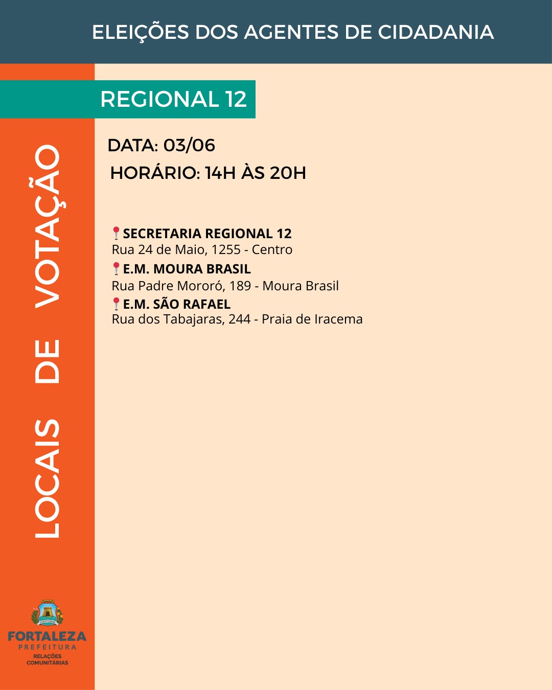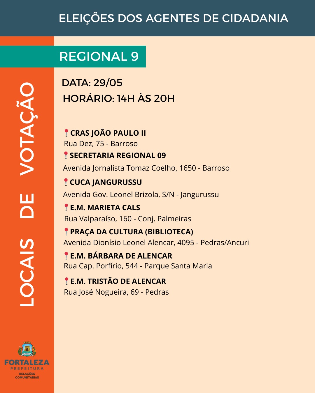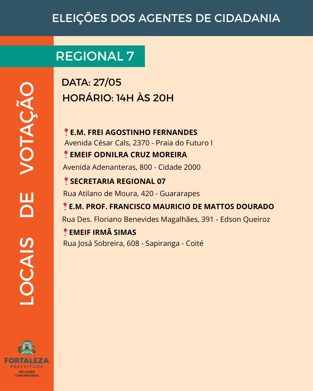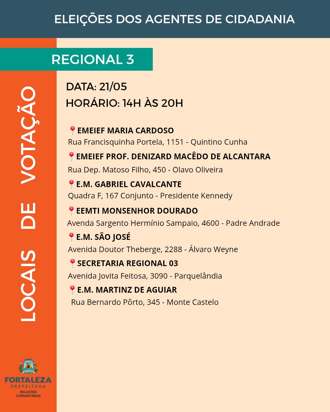 As vagas para agentes de cidadania estão distribuídas entre os 121 bairros e os 39 territórios da cidade, abrangendo as 12 Regionais de Fortaleza. A quantidade de representantes é definida com base na proporcionalidade populacional, garantindo a eleição de um agente para cada grupo de cinco mil habitantes, conforme os dados do Instituto Brasileiro de Geografia e Estatística (IBGE).
