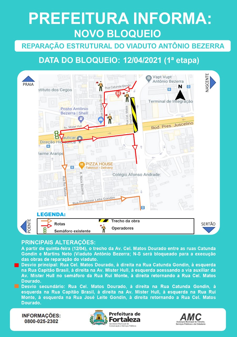 A Autarquia Municipal de Trânsito e Cidadania (AMC) orienta que os condutores, que trafegam pela Rua Cel. Matos Dourado, realizem o desvio à direita na Rua Catunda Gondin, sigam à esquerda pela Rua Capitão Brasil, acessem a Av. Mister Hull, retornando pela via auxiliar da Av. Mister Hull no semáforo da Rua Rui Monte e depois sigam à direita para retomar a Rua Cel. Matos Dourado.