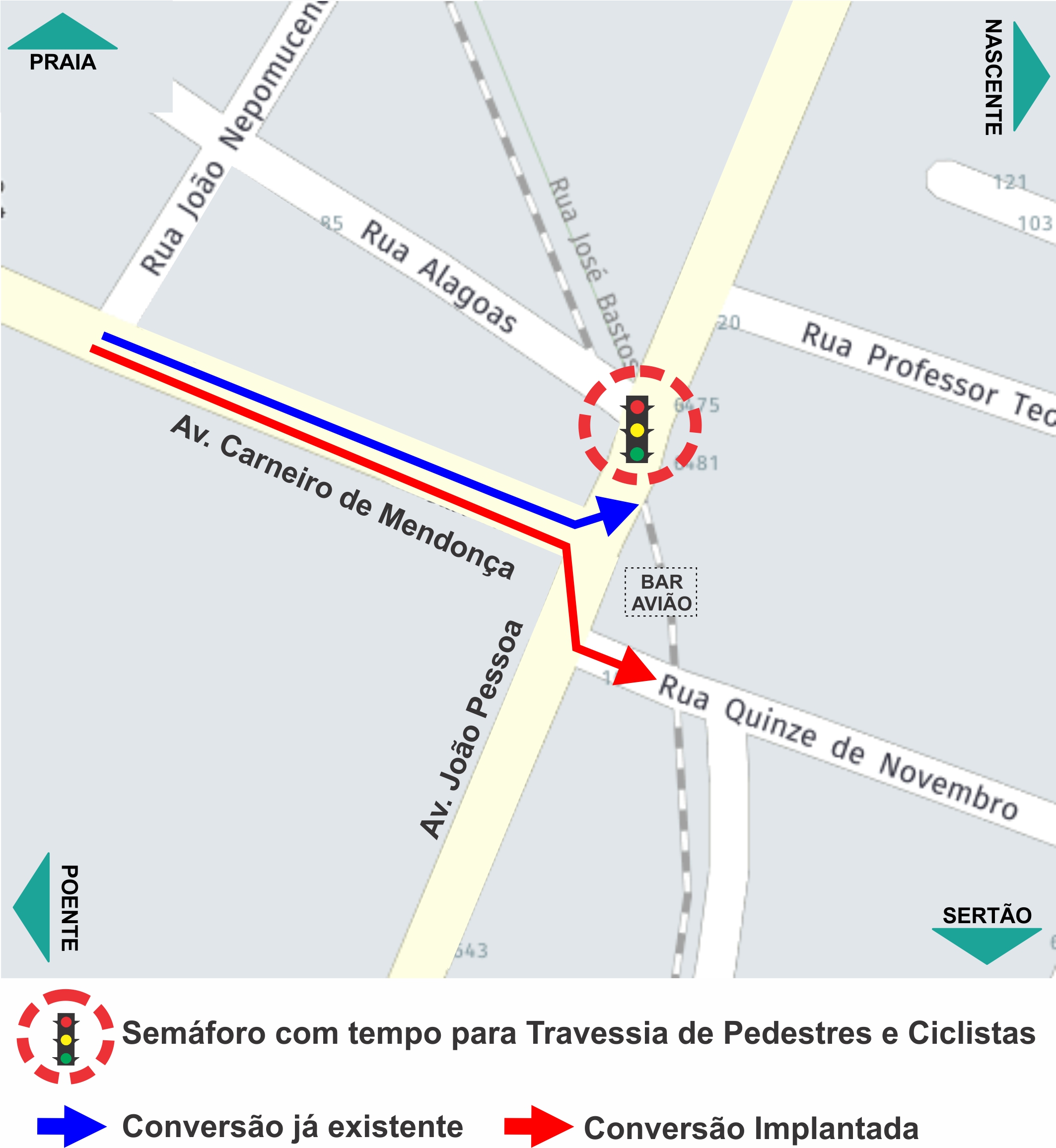 Visando à segurança na travessia de pedestres e ciclistas, a Autarquia Municipal de Trânsito e Cidadania (AMC) alterou a operação do semáforo situado no cruzamento da Av. João Pessoa com a Rua Carneiro de Mendonça. A intervenção, que foi concluída na noite desta quarta-feira (09/08), também pretende melhorar a acessibilidade dos motoristas que circulam na Av. Carneiro de Mendonça e desejam se deslocar para a Rua 15 de Novembro.