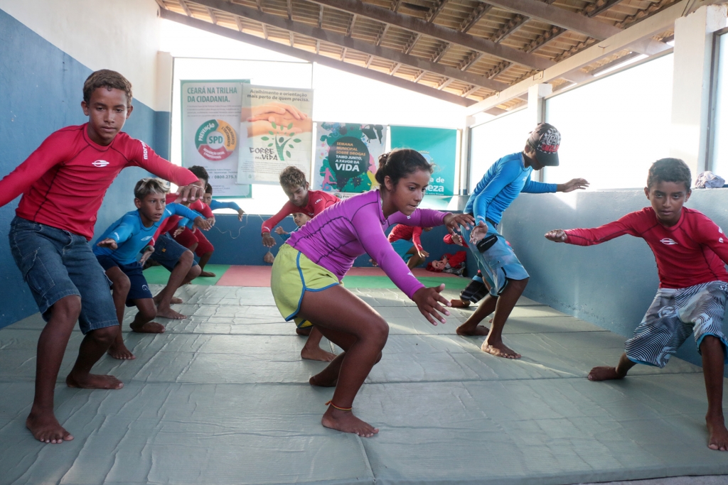 O papel do esporte na prevenção a comportamentos de riscos. Esse foi o tema da atividade “Conexão Esporte e Prevenção”, que ocorreu na tarde desta quarta-feira (22/06), na Escola Beneficente de Surf do Titanzinho (EBST) com crianças e adolescentes da comunidade. A ação fez parte do ciclo de atividades que estão sendo realizadas durante a IV Semana Municipal sobre Drogas, iniciada na última terça-feira (21/06), pela Prefeitura de Fortaleza, por meio da Coordenadoria Especial de Políticas sobre Drogas (CPDrogas). As atividades envolvem ações participativas, dialógicas, esportivas e multiculturais que seguem até o dia 26 de junho, encerrando com o II Passeio Ciclístico Pedalando pela Vida.