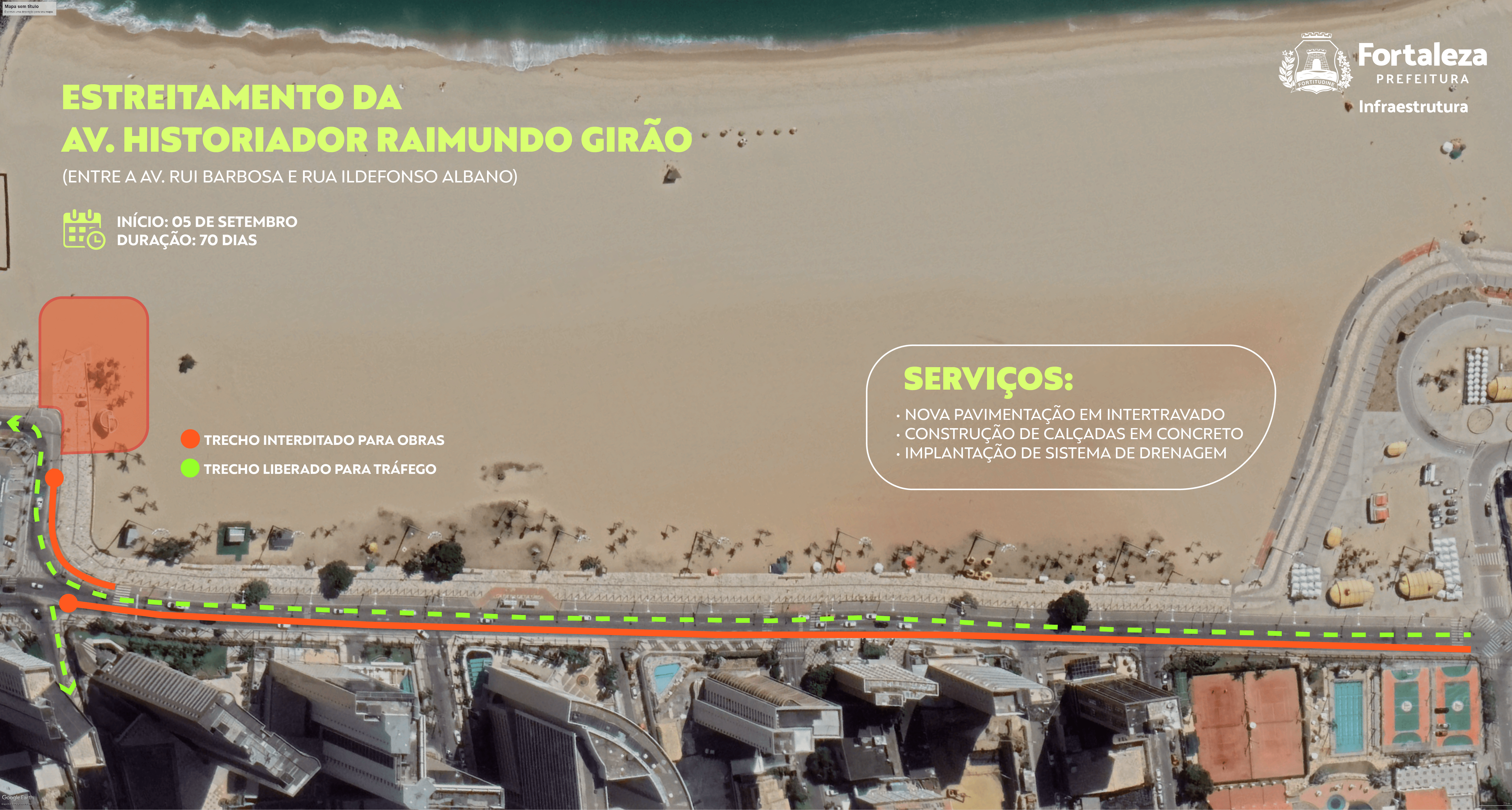 A Secretaria Municipal da Infraestrutura (Seinf) dará início, nesta terça-feira (05/09), a mais uma fase das obras de requalificação da Praia de Iracema. Os serviços vão acontecer na Av. Historiador Raimundo Girão, no trecho compreendido entre a Av. Rui Barbosa e Rua Ildefonso Albano, com a interdição parcial de uma das faixas da via, para a execução do sistema de drenagem, troca da pavimentação asfáltica por piso intertravado, urbanização e alargamento dos passeios.