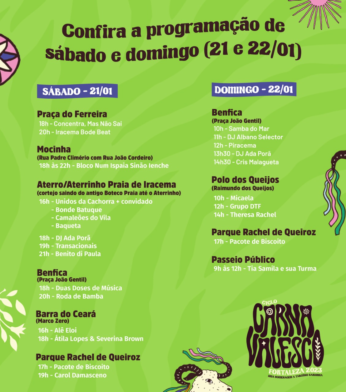 O polo da Mocinha, por sua vez, concentra o bloco Num Ispaia Sinão Ienche. O marco zero da Barra do Ceará terá a cantora cearense Alê Eloi e depois o axé misturado aos ritmos regionais de Átila Lopes e Severina Brown.