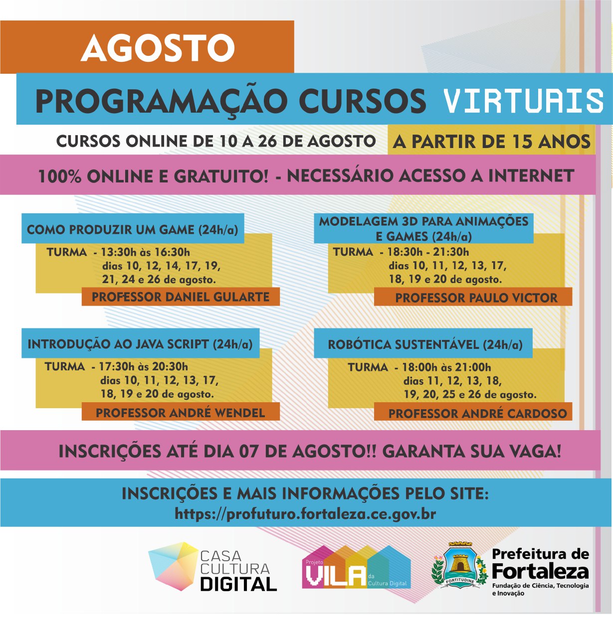 A Prefeitura de Fortaleza realiza, por meio da Fundação de Ciência, Tecnologia e Inovação (Citinova), cursos virtuais de tecnologia gratuitos e 100% on-line para jovens a partir de 15 anos de idade. A iniciativa faz parte das atividades desenvolvidas pela Vila da Cultura Digital. As inscriçõe...