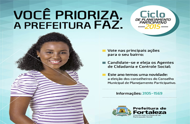 A Prefeitura de Fortaleza, por intermédio da Coordenadoria Especial de Participação Social, se prepara para dar início ao Ciclo de Planejamento Participativo de 2015, no qual a população tem a oportunidade de eleger as demandas consideradas prioritárias para o seu bairro e que vão fazer parte da Lei Orçamentária Anual (LOA) de 2016. Além disso, serão eleitos os Agentes de Cidadania e Controle Social e os conselheiros do Conselho Municipal de Planejamento Participativo, criado em dezembro de 2014.
