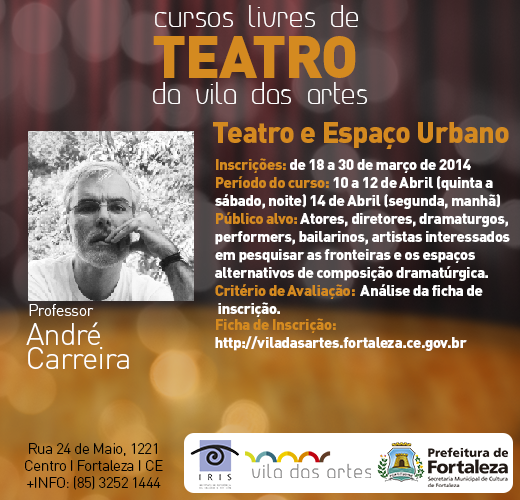 A Vila das Artes, equipamento da Prefeitura Municipal de Fortaleza, vinculado à Secretaria Municipal de Cultura (Secultfor), realiza, durante o primeiro semestre de 2014, seis cursos livres de teatro. O segundo curso a ser realizado será “Teatro e Espaço Urbano”, com André Carreira, que acontece de 10 a 14 de abril, sendo de quinta a sábado no período da noite e na segunda no período da manhã.