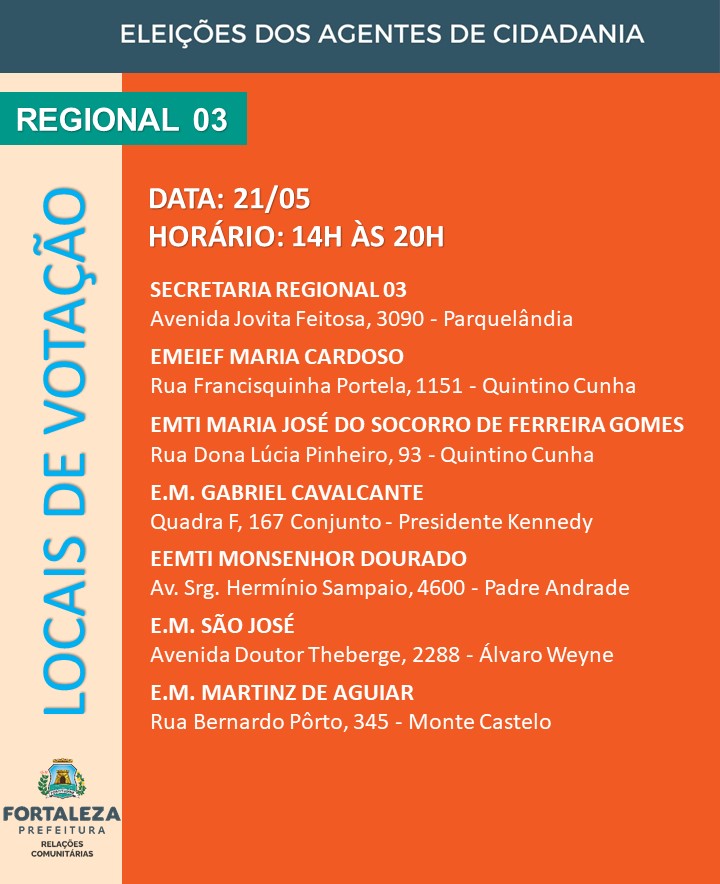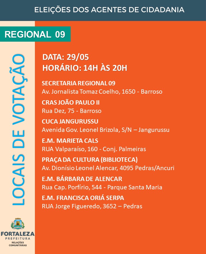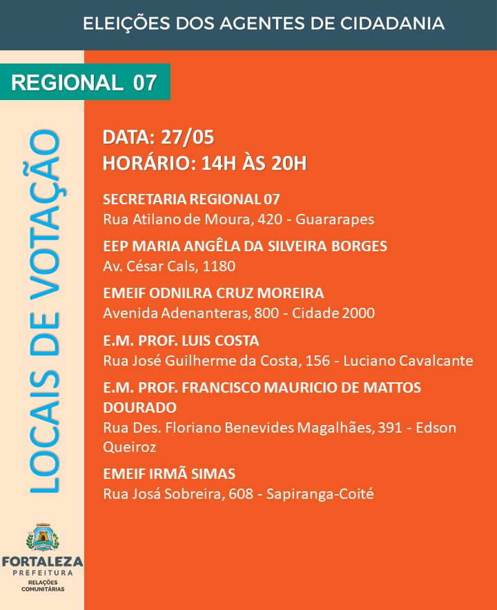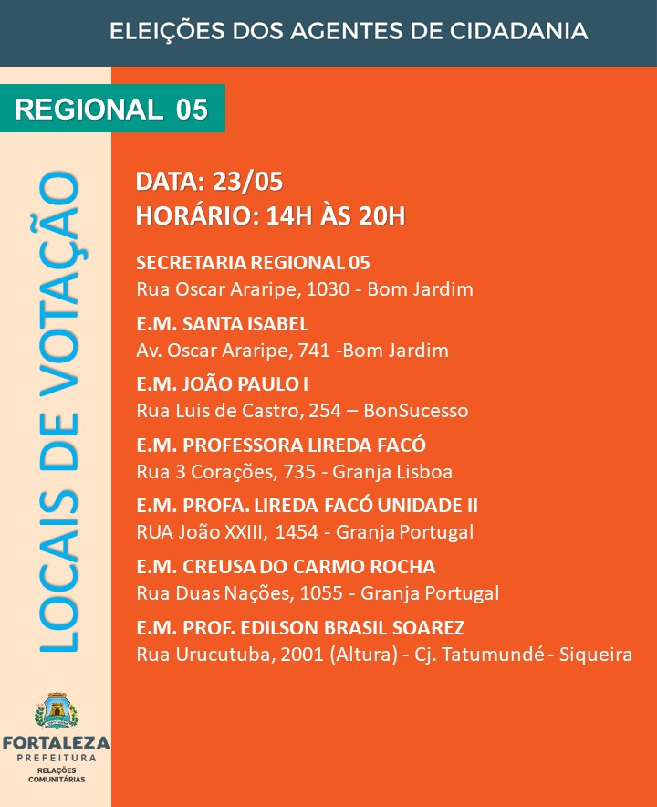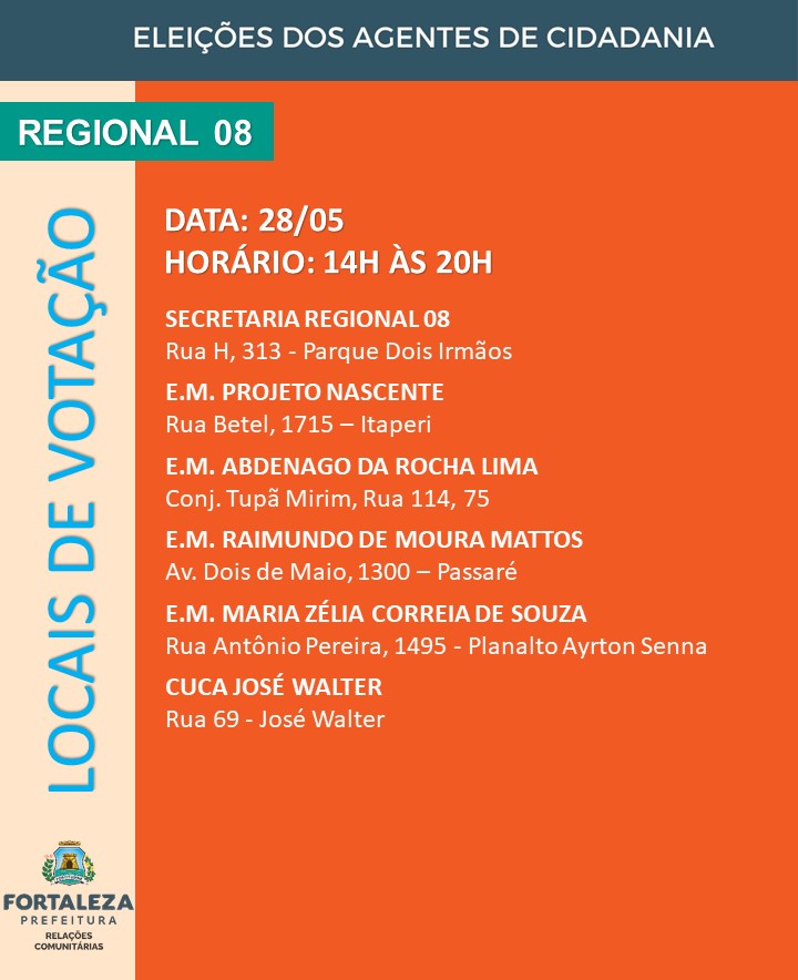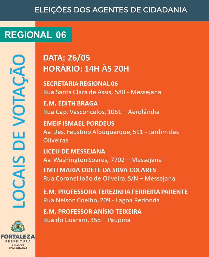 A Prefeitura de Fortaleza, por meio da Secretaria Municipal de Relações Comunitárias (Serc), realizará, entre os dias 19 de maio a 03 de junho, a eleição para Agentes de Cidadania e Controle Social (ACCS), biênio 2025/2026.