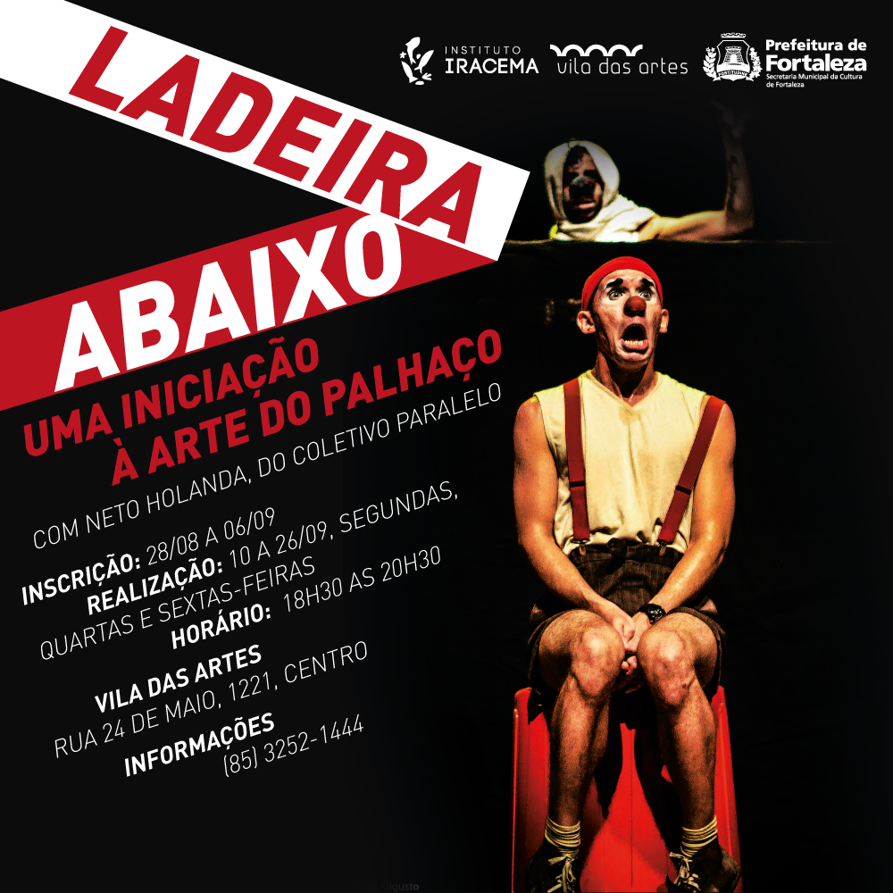 A Escola Pública de Circo da Vila das Artes promove o curso “Ladeira abaixo: Uma iniciação à arte do palhaço” com o facilitador Neto Holanda, do Coletivo Paralelo. As inscrições serão feitas mediante ficha de inscrição online e seguem até o dia 6 de setembro. A Vila das Artes é um equipamento da Prefeitura de Fortaleza e todas as suas atividades são gratuitas.