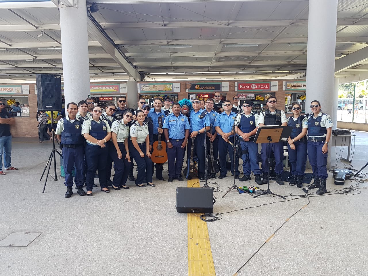 Dando início às atividades em comemoração ao aniversário de 60 anos da Guarda Municipal de Fortaleza, na manhã desta segunda-feira (01/07), o terminal da Messejana foi contemplado com a apresentação da banda Integração GMF que tocou clássicos da MPB, animando a manhã dos passageiros. Além da apresentação da banda, houve também a presença do palhaço Rapadura, que divertiu a criançada com brincadeiras e entrega de brindes. O intuito da ação é divulgar um processo de aprendizagem dinâmico e serviços preventivos oferecidos pela GMF para a população, focando na integração e responsabilidade social.