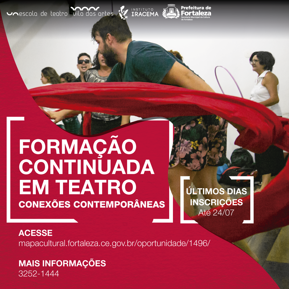 A Vila das Artes encerra na quarta-feira (24/07) o período de inscrições do curso “Formação Continuada em Teatro: Conexões Contemporâneas”. Gratuito e promovido pela Escola Pública de Teatro da Vila das Artes, a capacitação será um espaço de pesquisa, criação e experimentação, com o objetivo de fortalecer e consolidar as ações dos artistas e coletivos de teatro na Cidade. As inscrições devem ser feitas online pelo Mapa Cultural de Fortaleza.