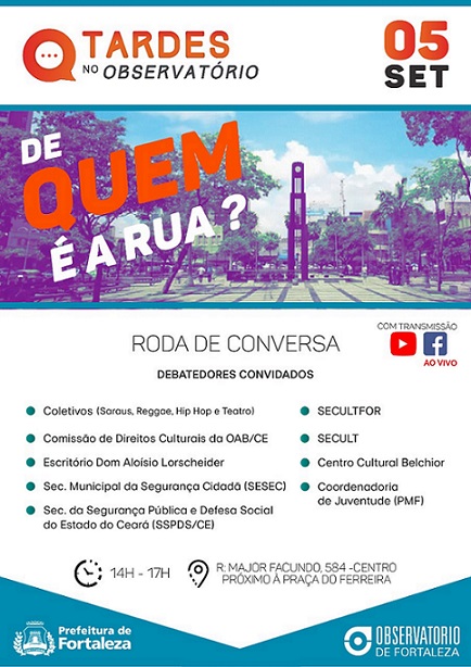 A Prefeitura de Fortaleza realiza, por meio Observatório de Fortaleza, na tarde desta quinta-feira (05/09), um debate sobre o tema "De quem é a rua?". A roda de conversa abordará a troca de experiências sobre os diferentes usos dos espaços públicos por grupos de jovens de diversos bairros da Cidade, onde acontecem saraus, bailes de reggae e batalhas de hip hop. O evento é aberto ao público e faz parte do projeto “Tardes no Observatório”, que ocorre todas as quintas-feiras no Observatório de Fortaleza e é dirigido pela professora Cláudia Leitão.