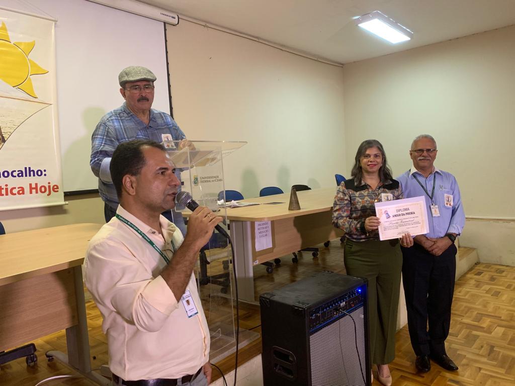 O Plantão Gramatical recebeu o diploma “Amigo da Poesia” nesta quinta-feira (14/03). A condecoração, concedida pelo Grupo Chocalho em reconhecimento ao trabalho em defesa da liberdade, democracia e cultura, foi entregue na celebração do Dia da Poesia, realizada na Casa José de Alencar.