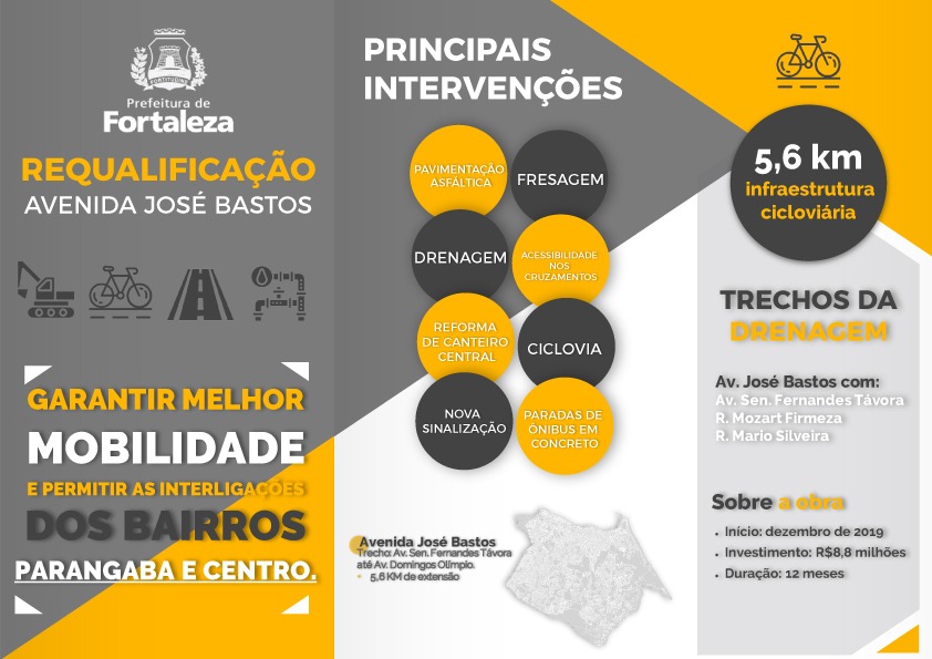 As obras preveem a requalificação da Av. José Bastos no trecho entre as avenidas Senador Fernandes Távora e Domingos Olímpio, com a adequação do canteiro central com ciclovia bidirecional, nova pavimentação, além de piso em concreto nas paradas de ônibus, faixa exclusiva para o transporte coletivo e redesenho na sinalização da via, que passará a atender a todos os modais.