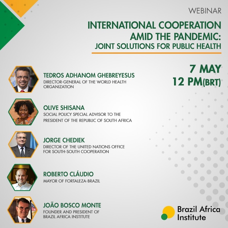 O intercâmbio de experiências oriundas do atual quadro pandêmico será fortalecido pela participação da assessora especial de política social do presidente da República da África do Sul, Olive Shisana, e do diretor do escritório das Nações Unidas para a Cooperação Sul-Sul, Jorge Chediek. A mediação ficará a cargo do fundador e presidente do Brazil Africa Institute, João Bosco Monte.