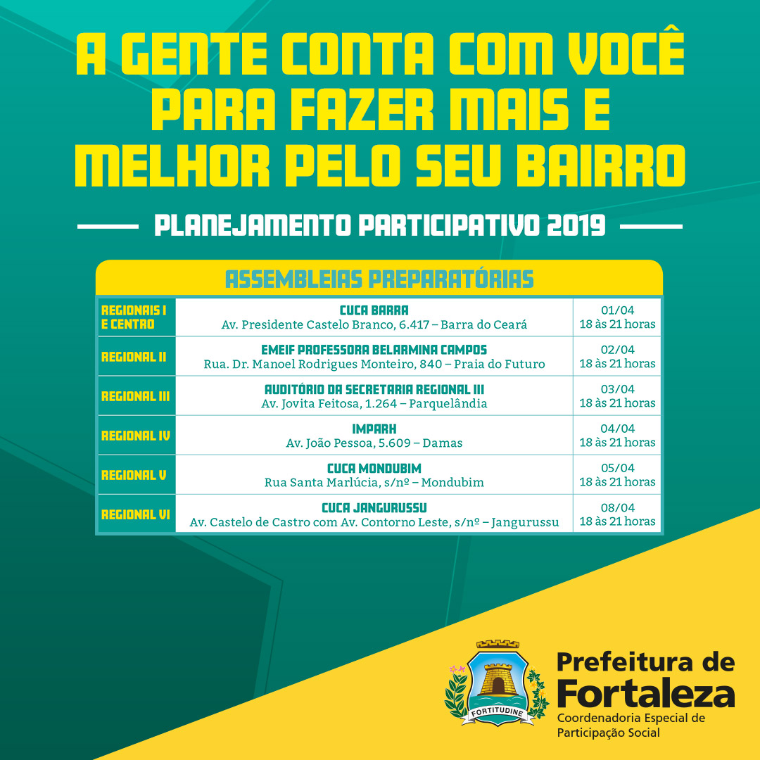 A Prefeitura de Fortaleza, por intermédio da Coordenadoria Especial de Participação Social (CEPS), vai dar início ao Ciclo de Planejamento Participativo com a assembleia preparatória da Regional I, que será realizada nesta segunda-feira (01/04), a partir das 18 horas, no Cuca Barra. O ciclo é um processo de planejamento realizado, anualmente, de forma democrática, no qual a população tem a oportunidade de apontar as necessidades do seu bairro e votar nas propostas que considera prioritárias. Essas propostas, após análise da Secretaria do Planejamento, Orçamento e Gestão (Sepog), poderão fazer parte da Lei Orçamentária Anual (LOA) do ano subsequente.