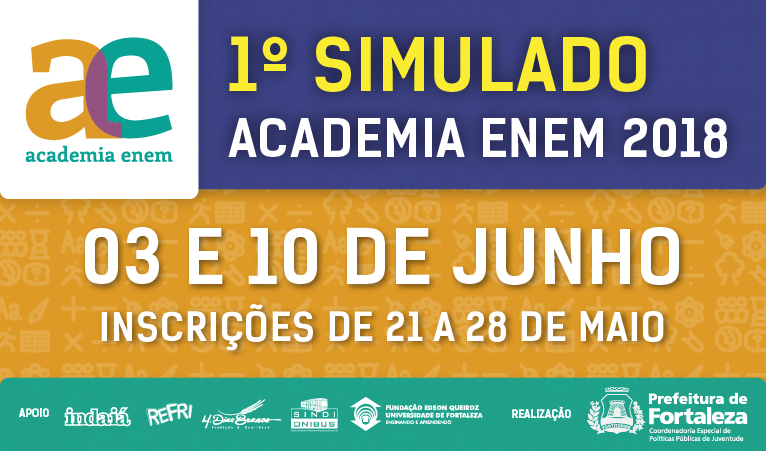 As provas, que estarão de acordo com os novos critérios do Enem, serão aplicadas na Universidade de Fortaleza (Unifor), nos dias 3 e 10 de junho. Poderão realizar a inscrição no simulado os alunos devidamente matriculados no Academia Enem 2018. Para se inscrever, os interessados deverão acessar o Portal Juventude (juvi.com.br) e atualizar as informações do cadastro.
