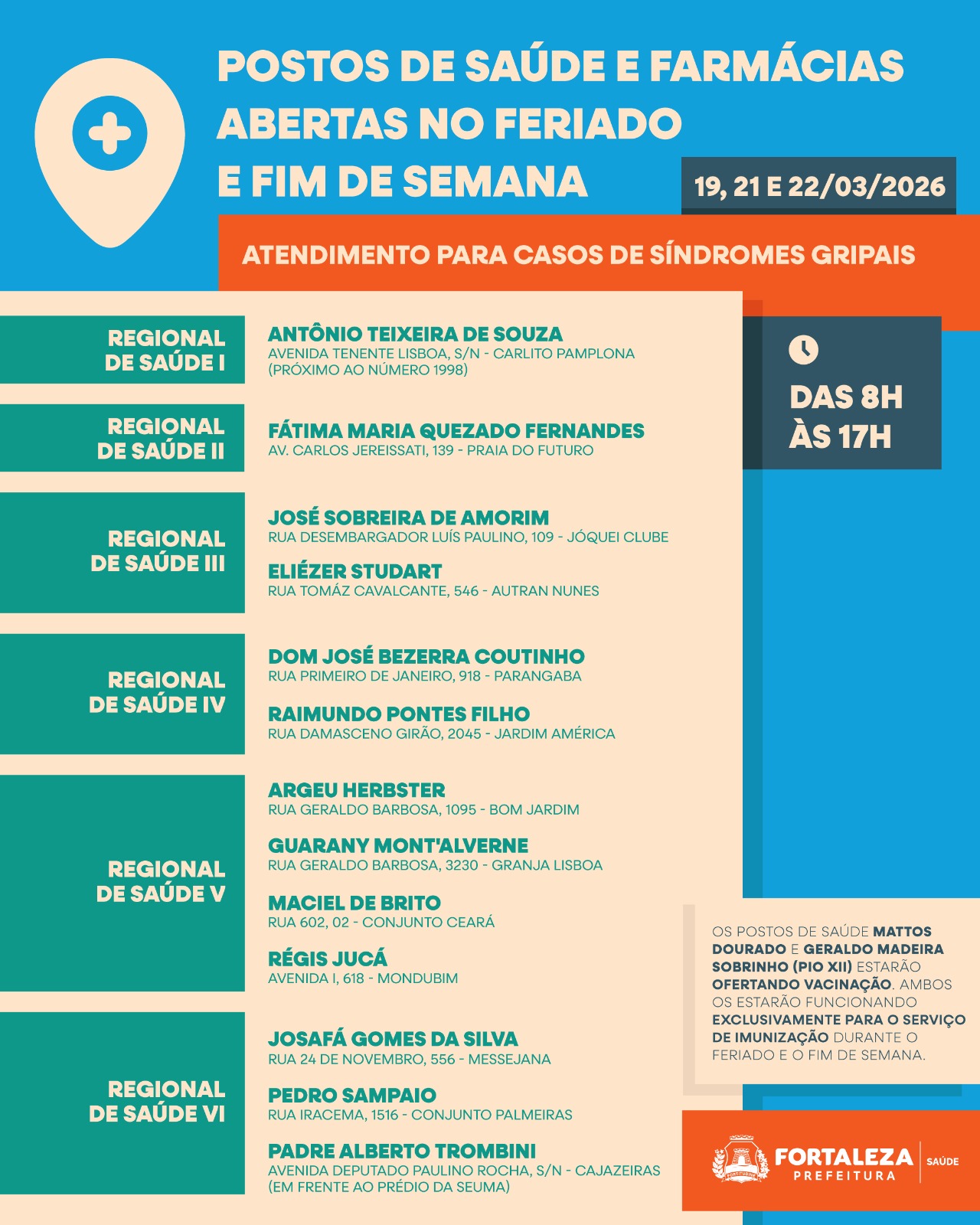 A Prefeitura de Fortaleza manterá 13 postos de saúde em funcionamento durante o feriado de Dia de São José, nesta quinta-feira (19/3), e também no fim de semana (21 e 22/3). As unidades funcionarão das 8h às 17h. A medida reforça a assistência à população em diferentes bairros da Capital, garantindo acesso aos serviços de saúde sem sobrecarregar os hospitais.