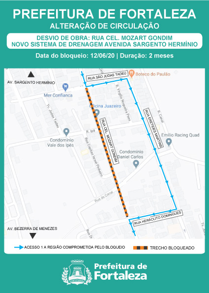 Para viabilizar as obras de drenagem, o fluxo da Rua Cel. Mozart Gondim que se dirige à Av. Bezerra de Menezes deve entrar à esquerda na Rua São Judas Tadeu, à direita na Rua Eretides Martins (que passará a operar com sentido duplo de circulação entre as ruas São Judas Tadeu e Heráclito Domingues), à direita na Rua Heráclito Rodrigues e à esquerda na Rua Cel. Mozart Gondim.