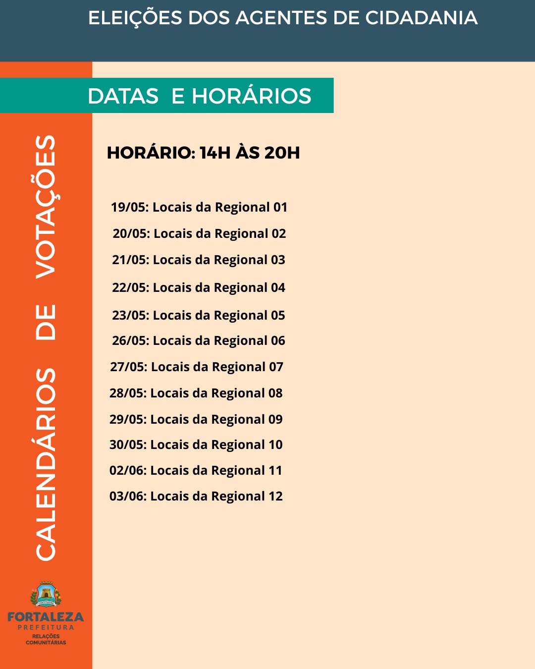As vagas para agentes de cidadania estão distribuídas entre os 121 bairros e os 39 territórios da cidade, abrangendo as 12 Regionais de Fortaleza. A quantidade de representantes é definida com base na proporcionalidade populacional, garantindo a eleição de um agente para cada grupo de cinco mil habitantes, conforme os dados do Instituto Brasileiro de Geografia e Estatística (IBGE).