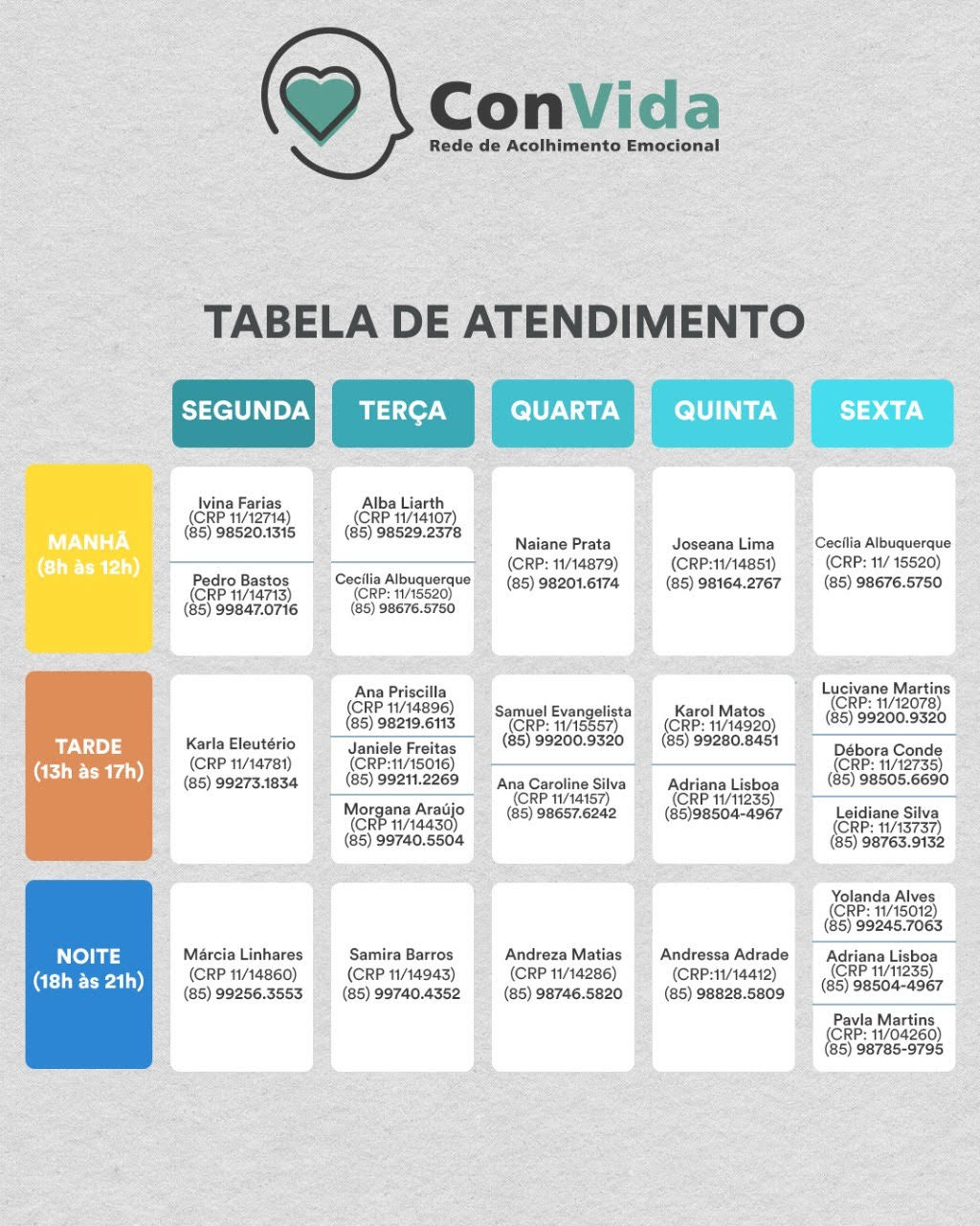 Os atendimentos são disponibilizados em três turnos (veja a tabela de atendimento). Cada acolhida tem duração de 30 minutos. Para participar, é necessário ser maior de 18 anos. Vale reforçar que a ação não remete a tratamento psicológico, e sim a acolhimento emocional, estimulado pelos impactos gerados pela Covid-19.