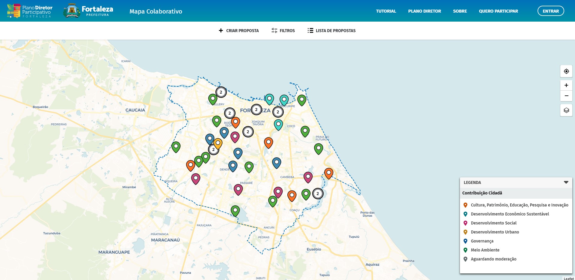 A Prefeitura de Fortaleza, por meio do Instituto de Planejamento (Iplanfor), entrega o Mapa Colaborativo do Plano Diretor à Cidade com o objetivo de facilitar o registro das propostas dos cidadãos de forma georreferenciada na construção do Plano Diretor Participativo (PDP), permitindo também uma moderação, para que o planejamento do município atenda às necessidades coletivas de toda a população. A ferramenta está disponível para navegação no site do PDP e faz parte da segunda etapa dele. A plataforma é inspirada no mapa colaborativo da plataforma Fortaleza 2040 e possui tecnologia da ferramenta Fortaleza em Mapas.