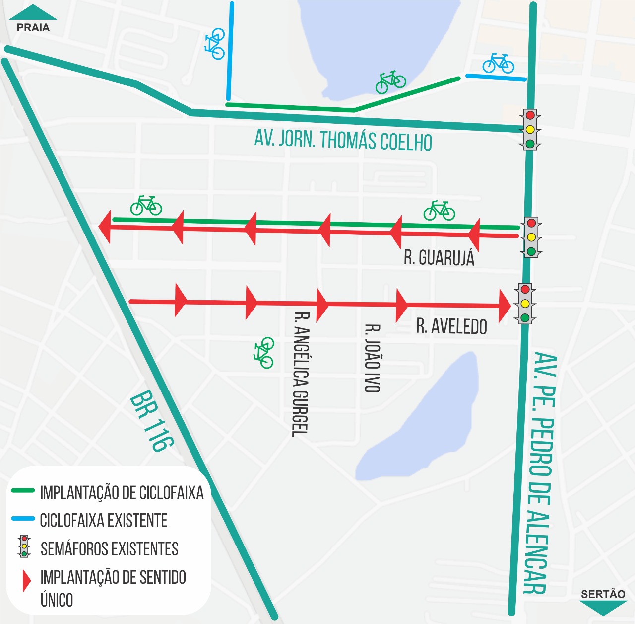 Para atender aos deslocamentos dos ciclistas, uma nova ciclofaixa passará a funcionar ao longo da Rua Guarujá. Com 1 km de extensão, a infraestrutura cicloviária vai interligar a Av. Padre Pedro de Alencar à BR-116.