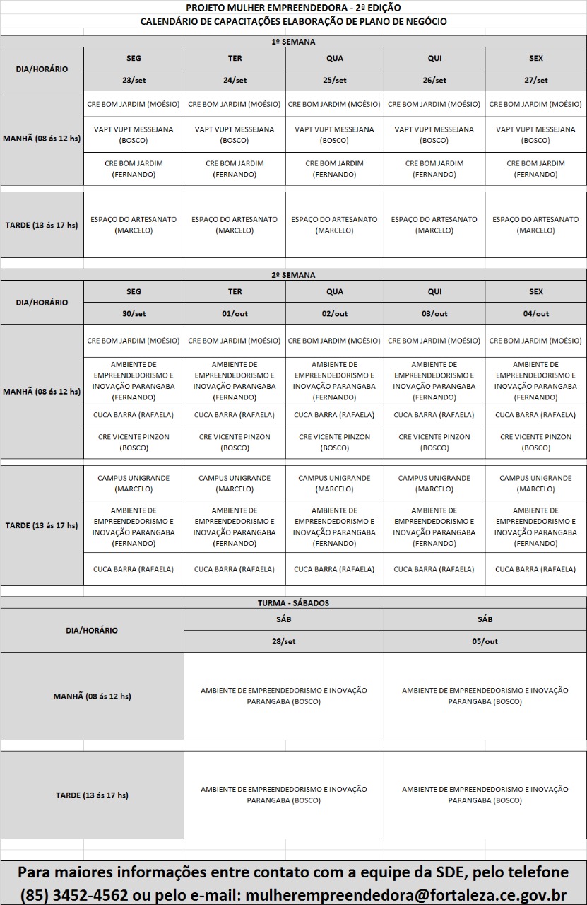 A Prefeitura de Fortaleza iniciou, por meio da Secretaria Municipal do Desenvolvimento Econômico (SDE), nesta segunda-feira (23/09), o processo de capacitação para os 98 empreendimentos habilitados a participar do Projeto Mulher Empreendedora. As aulas, que têm duração de 20h/a, já estão sendo ministradas nos Centros de Referência do Empreendedor do Bom Jardim e Vicente Pinzón, Vapt Vupt Messejana, Espaço do Artesanato da SDE, Cuca Barra do Ceará, Ambiente de Empreendedorismo e Inovação da Parangaba e no Campus do Centro Universitário da Grande Fortaleza (UNIGRANDE).