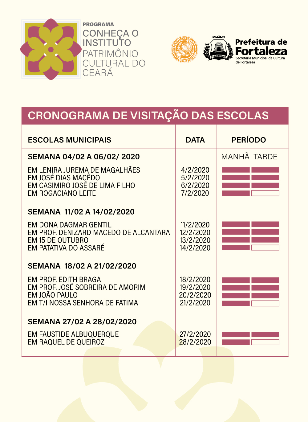 Fruto de edital público lançado pela Secultfor, o Programa de Educação Patrimonial firmado com o Instituto do Ceará destina um montante de R$ 220.850,00 a atividades de preservação do patrimônio. A ação atende aos usuários das escolas municipais e promove ações formativas de educação patrimonial com professores.