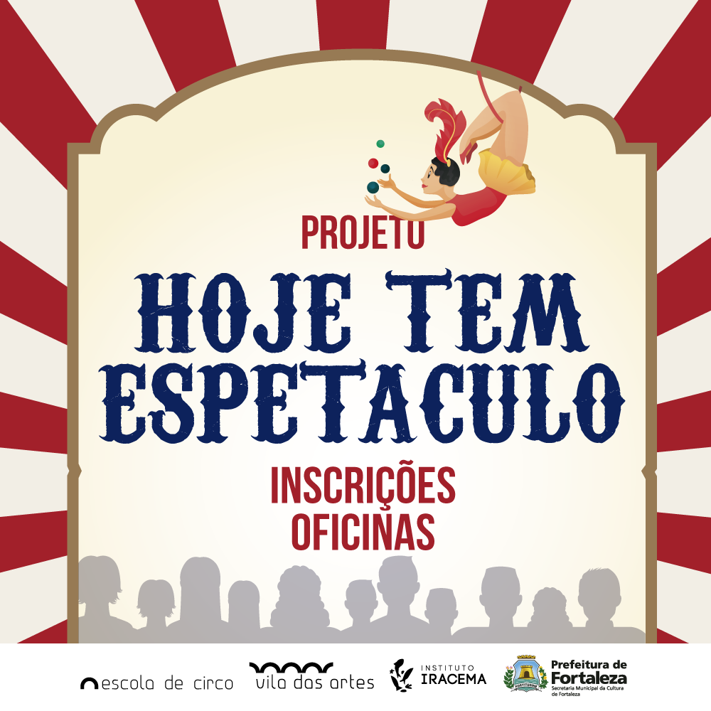 A Escola Pública de Circo da Vila das Artes realiza o projeto “Hoje tem Espetáculo”, com quatro oficinas circenses gratuitas em diferentes lugares da cidade. Interessados podem participar do processo seletivo gratuito, a partir desta segunda-feira (26/11), no site da Vila das Artes. A Vila das Artes é um equipamento da Prefeitura de Fortaleza, coordenado pela Secretaria Municipal da Cultura de Fortaleza (Secultfor).