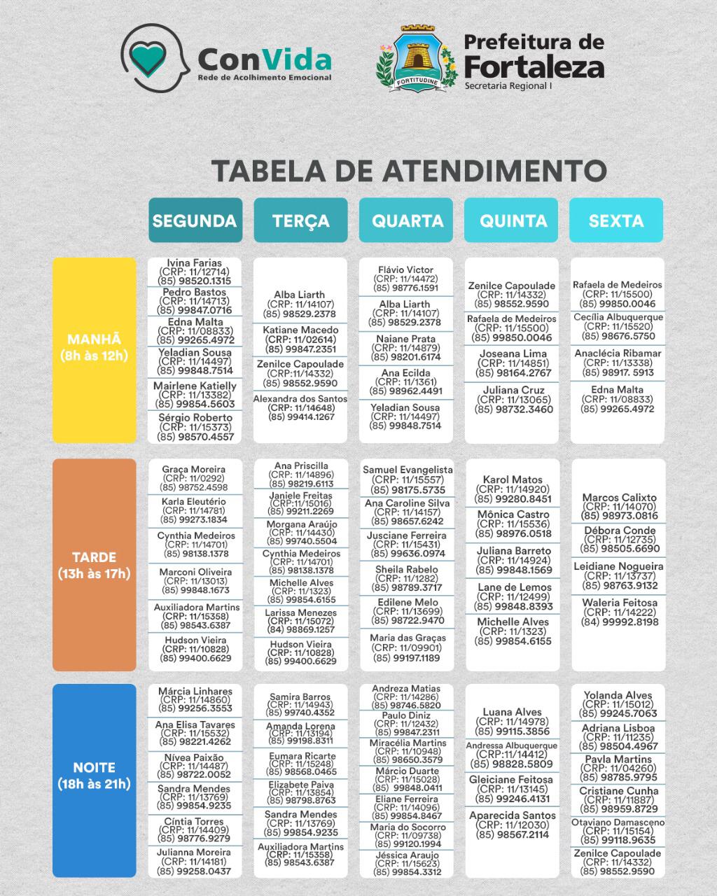 Todos os profissionais participantes são autorizados pelo Conselho Regional de Psicologia para realização de atendimento a distância. Para informações complementares sobre a Rede de Acolhimento Emocional ConVida, falar com Lucivane Martins, por meio do (85) 99200.9320. O acolhido deve ter idade superior a 18 anos.