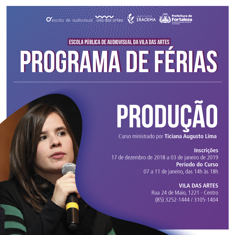 A Escola Pública de Audiovisual da Vila das Artes abre a temporada de cursos gratuitos com o Programa de Férias da EAV, realizado durante o mês de janeiro de 2019. A primeira atividade formativa lançada, nesta segunda-feira (17/12), é o Curso de Produção, com a realizadora Ticiana Augusto L...Categorias