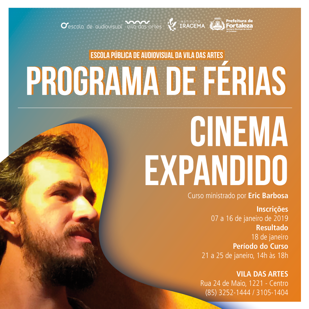 A Escola Pública de Audiovisual da Vila das Artes (EAV) lança, nesta segunda-feira (07/01), o curso “Cinema Expandido”, com o produtor e artista multimídia Eric Barbosa. Esta é a segunda atividade do Programa de Férias da EAV, realizado durante o mês de janeiro de 2019, que conta com a a...