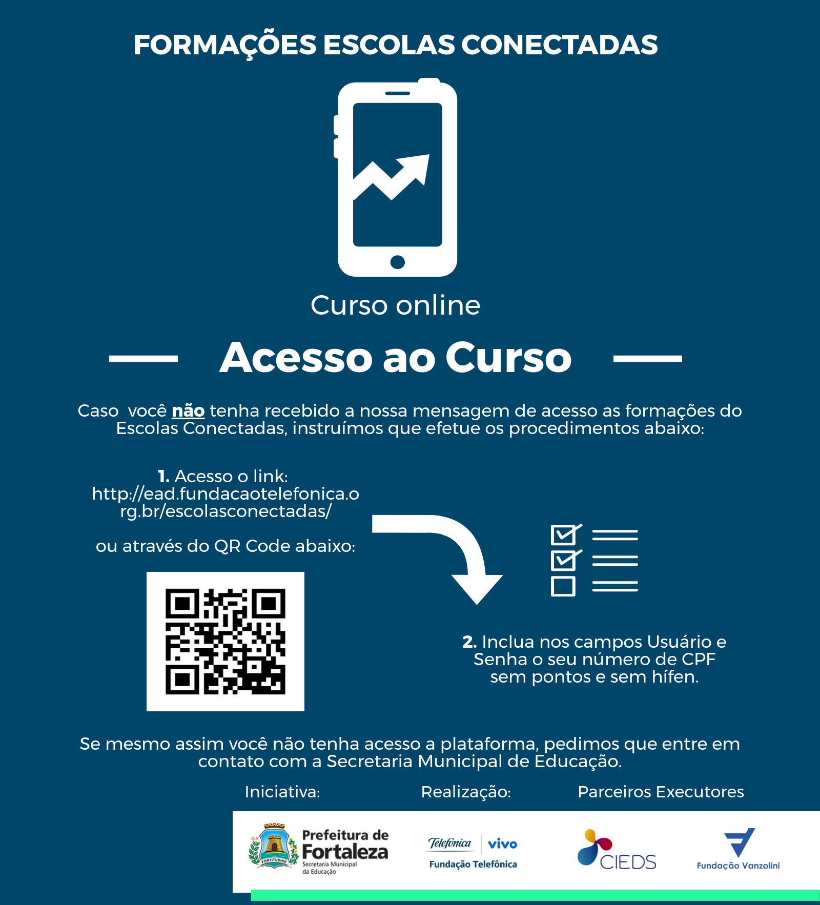 A Prefeitura de Fortaleza informa, por meio da Secretaria Municipal de Educação (SME), em parceria com a Fundação Telefônica Vivo, que os cursos do Projeto Escolas Conectadas foram iniciados nesta semana. Aos professores que não receberam a mensagem de acesso às formações, a SME orienta q...