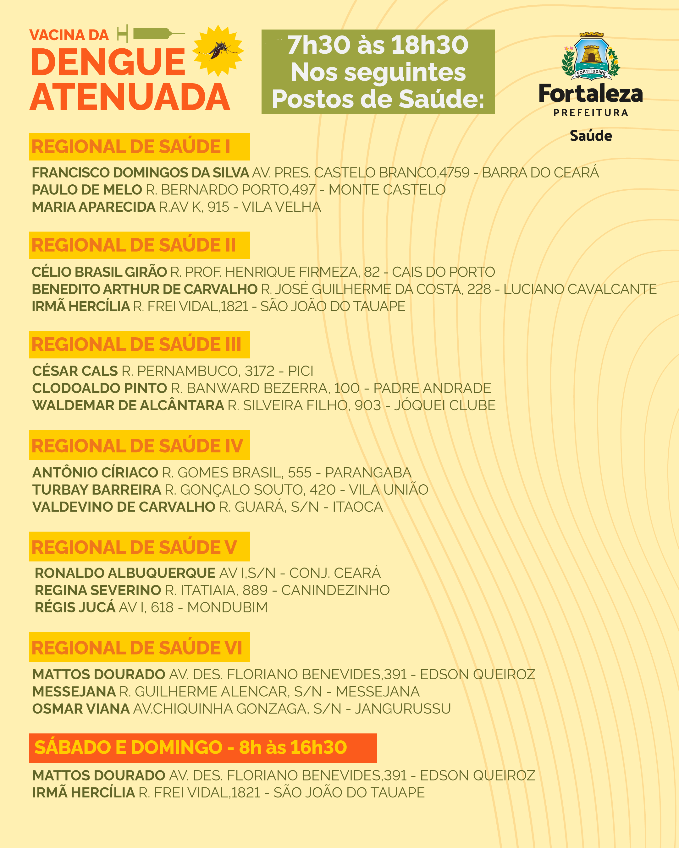 A partir desta segunda-feira (13/05), fortalezenses com idade entre 10 e 14 anos (14 anos, 11 meses e 29 dias) poderão receber a vacina contra a dengue. O imunizante estará disponível em 18 postos de saúde, de segunda a sexta-feira, das 7h30 às 18h30; e aos fins de semana e feriados, em dois po...