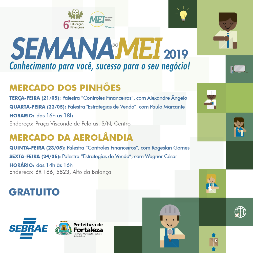 O Mercado dos Pinhões e o Mercado da Aerolândia recebem, entre terça e sexta-feira (21 e 24/05), atividades da grade de programação da Semana do MEI (Micro Empreendedor Individual) 2019. O evento é uma realização do Sebrae com apoio da Prefeitura de Fortaleza, por meio da Secretaria Mu...