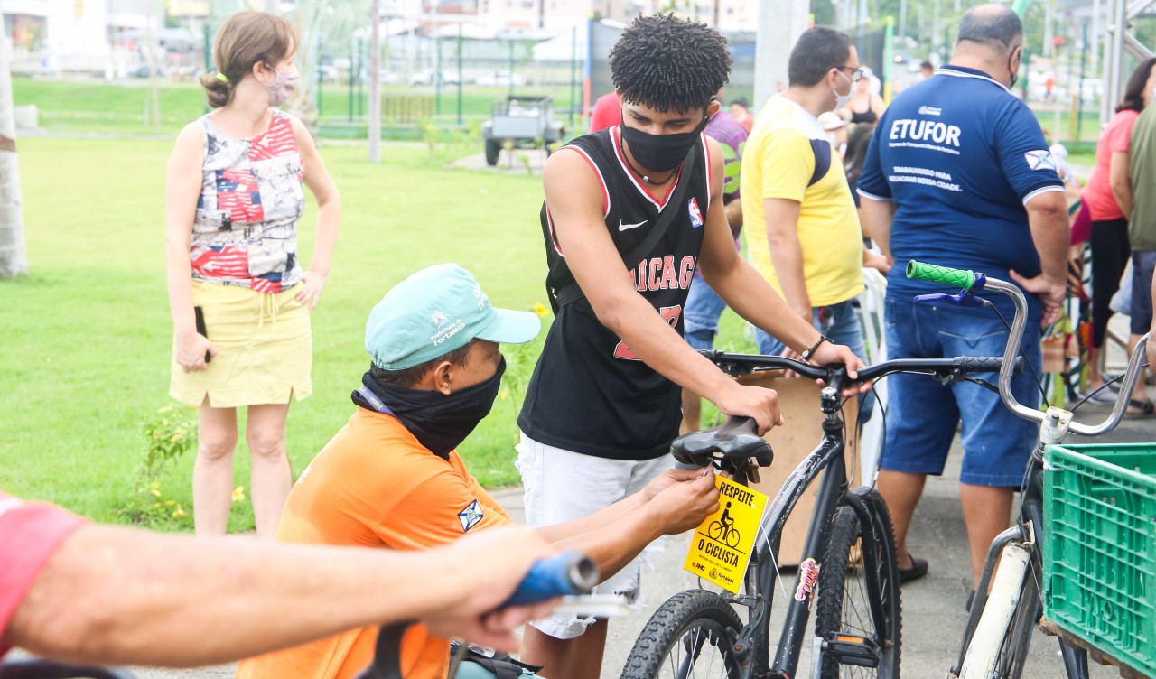 Ciclofaixa de Lazer distribui plaquinhas que incentivam o respeito aos ciclistas no Parque Rachel de Queiroz