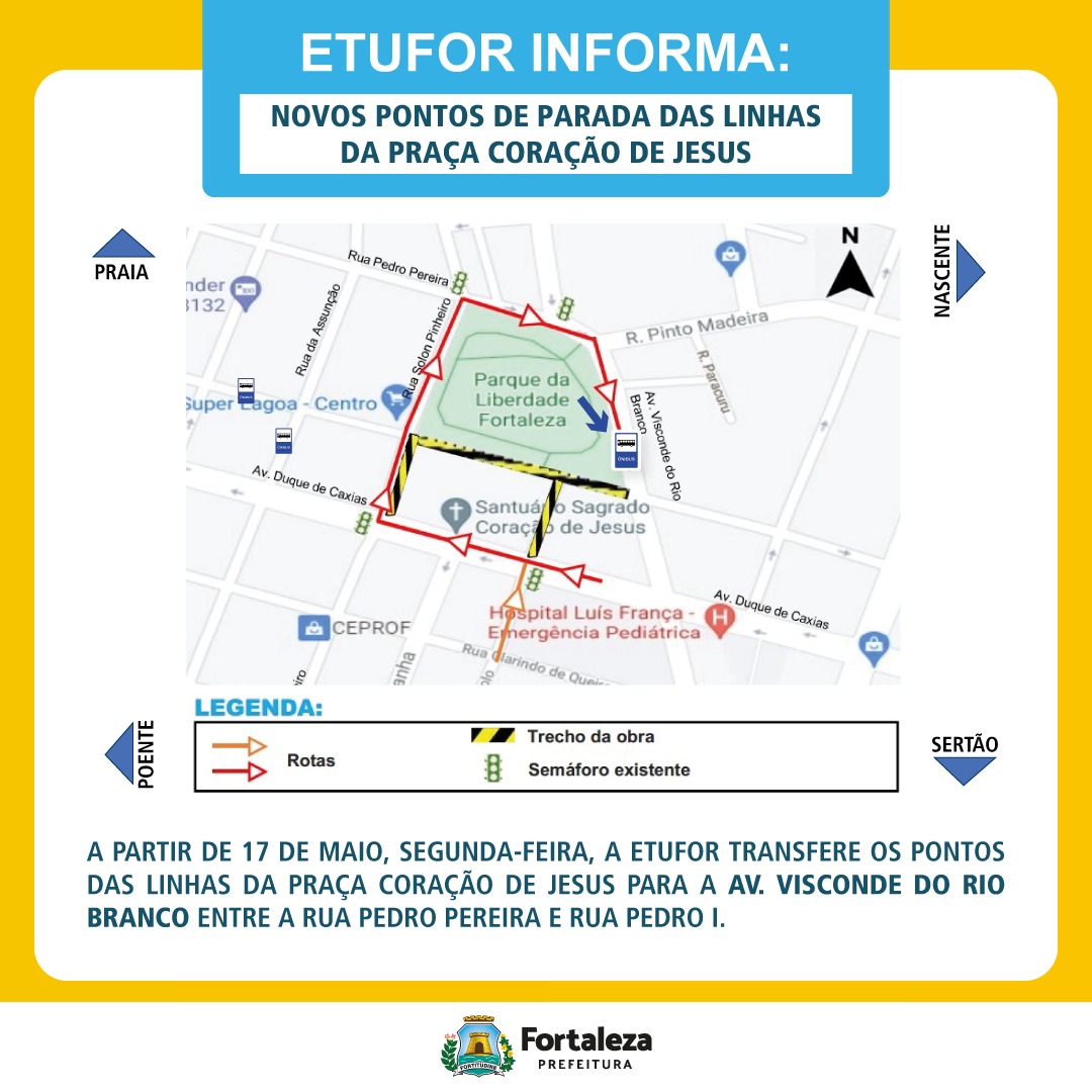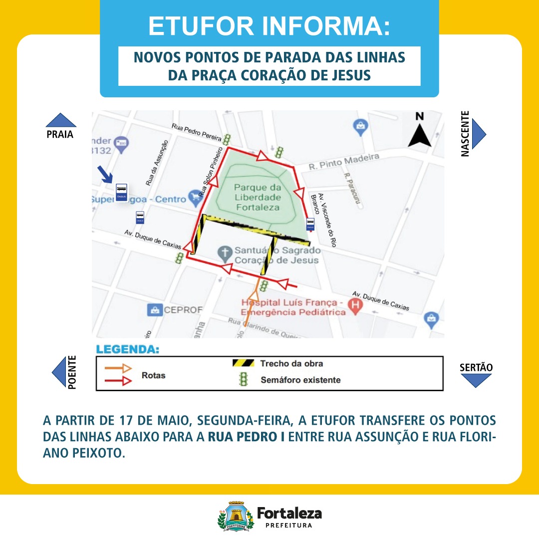 A Prefeitura de Fortaleza, por meio da Secretaria Municipal da Infraestrutura (Seinf), informa que, a partir da próxima segunda-feira (17/05), os trechos das ruas Pedro I, Solon Pinheiro e Jaime Benévolo, localizados no entorno da Praça do Sagrado Coração de Jesus, no Centro, passarão por bloq...