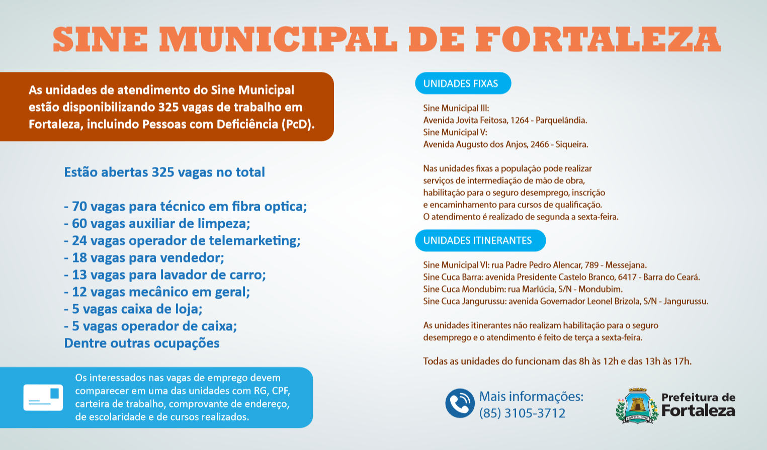 As unidades de atendimento do Sine Municipal estão disponibilizando 325 vagas de trabalho em Fortaleza, incluindo Pessoas com Deficiência (PcD). Os equipamentos da Prefeitura de Fortaleza, geridos pela Secretaria Municipal do Desenvolvimento Econômico (SDE) em parceria com o Ministério da Econom...Categorias