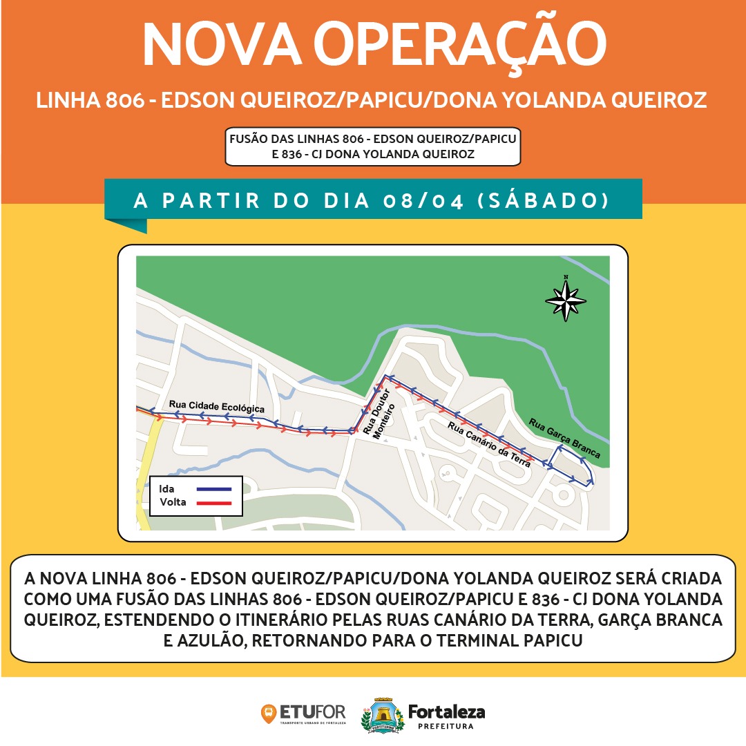 A Empresa de Transporte Urbano de Fortaleza (Etufor) altera, a partir de terça-feira (22/4), o itinerário da linha 905 - Meireles/Centro, passando a atender aos moradores do Residencial Alto da Paz, localizado no bairro Cais do Porto. A linha conta com frota de quatro veículos, que funcionam com ...