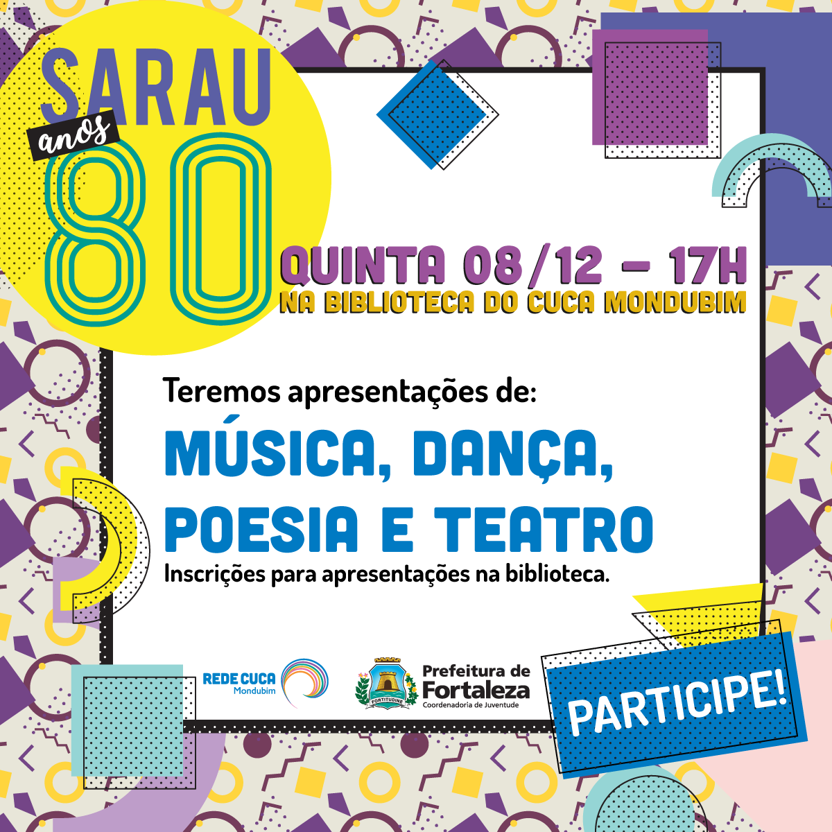 A Prefeitura de Fortaleza promove, nesta quinta-feira (08/12), o Sarau anos 80, na biblioteca da Rede Cuca Cuca Mondubim. O evento, que envolve poesia, dança, leitura de livros, música, pintura e teatro, começará às 17h. A iniciativa tem o objetivo de incentivar os jovens a se expressarem ou...Categorias