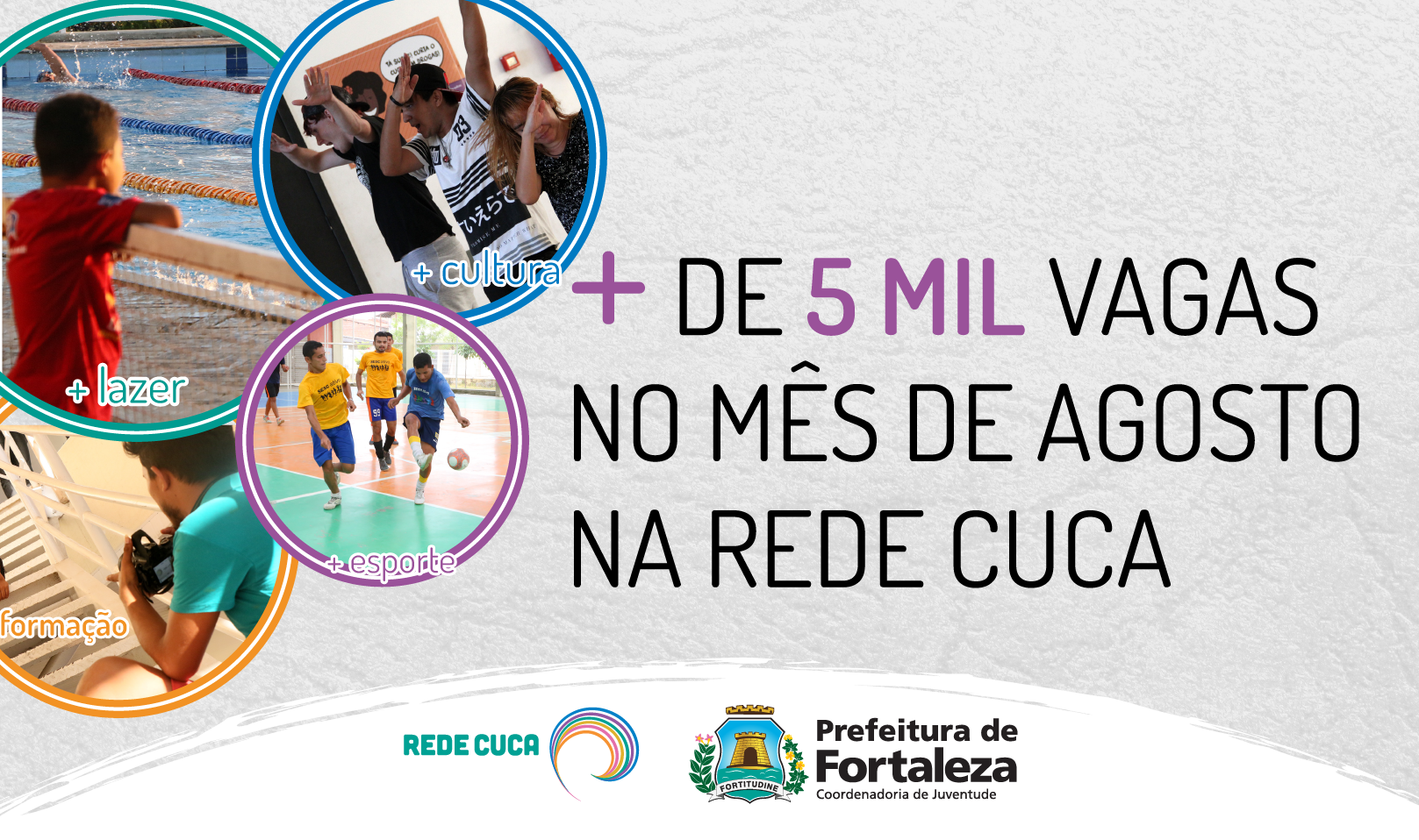 A Prefeitura de Fortaleza, por meio da Coordenadoria Especial de Políticas Públicas de Juventude, oferta 5.605 vagas no mês de março para cursos e práticas esportivas na Rede Cuca. As inscrições são gratuitas, voltadas para jovens com idade entre 15 e 29 anos, e podem ser realiza...