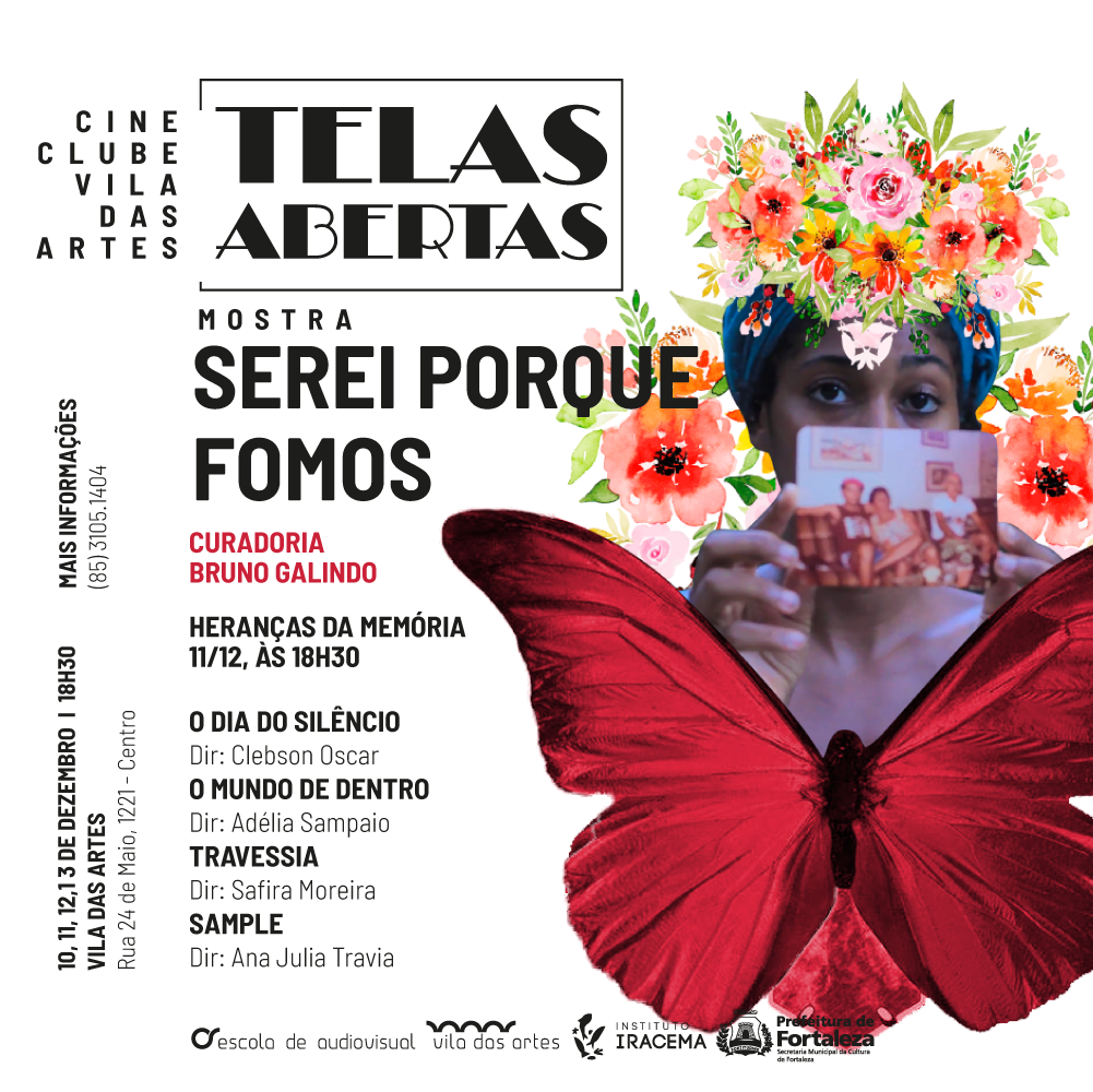 A Escola Pública de Audiovisual da Vila das Artes divulga programação do cineclube Telas Abertas de dezembro. A mostra “Serei Porque Fomos”, com curadoria de Bruno Galindo, ocorrerá entre os dias 10 e 13 de dezembro, às 18h30, na Vila das Artes. Esta é a sexta e última mostra do cinecl...