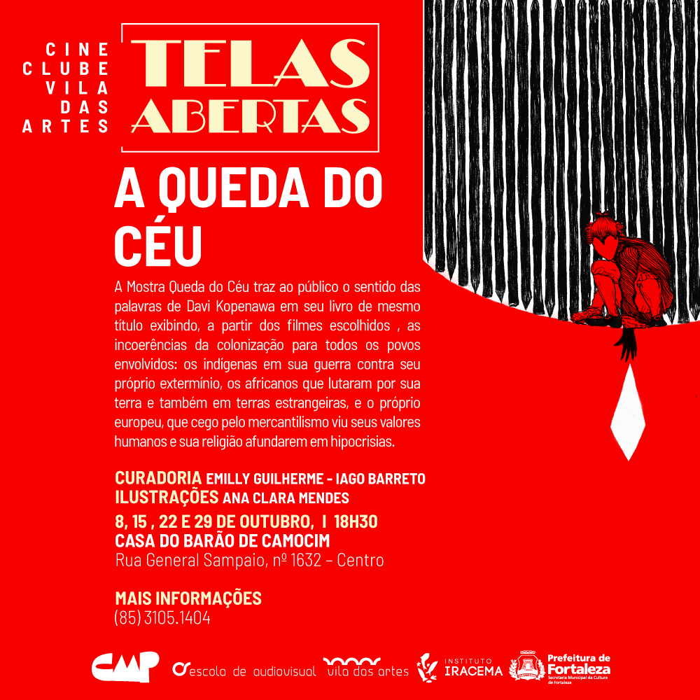 A Escola Pública de Audiovisual da Vila das Artes divulga programação do cineclube Telas Abertas de outubro. A mostra “A Queda do Céu”, com curadoria de Emilly Guilherme e Iago Barreto, ocorrerá nos dias 8, 15, 22 e 29 de outubro, às 18h30, no Centro Cultural Casa do Barão de Camocim. ...Categorias