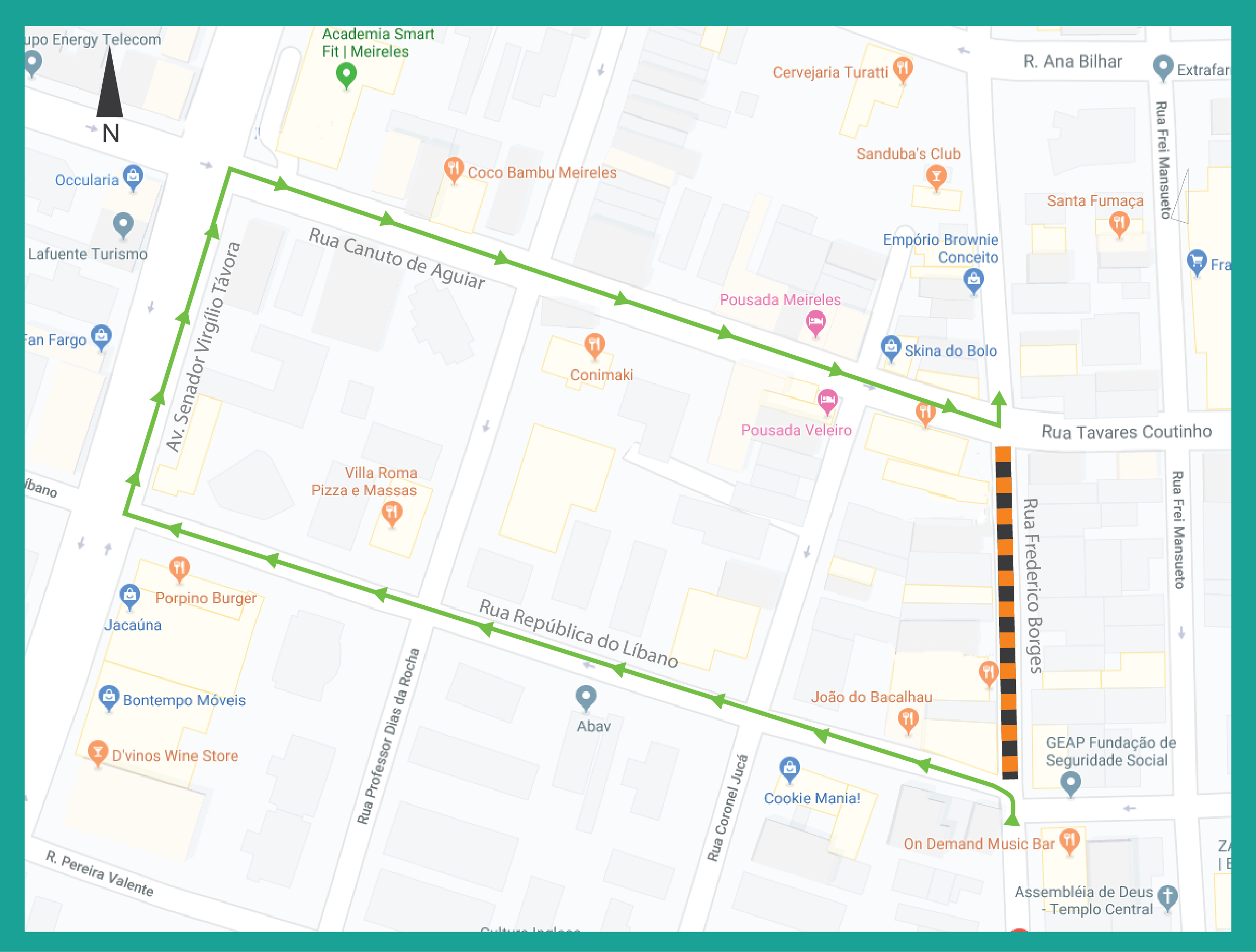 Os serviços, especificamente neste trecho, acontecem até o dia 18 e contarão com o suporte operacional dos agentes da AMC. A orientação para quem segue na Rua Frederico Borges é dobrar à esquerda na Rua República do Líbano, à direita na Av. Virgílio Távora e à direita na Rua Canuto de Aguiar. Confira o mapa