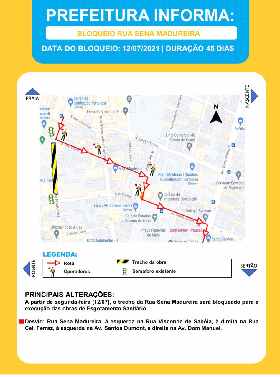 A partir desta segunda-feira (12/07), o trecho da Rua Sena Madureira, entre as ruas Visconde de Saboia e do Pocinho, no Centro, será bloqueado para a execução das obras de esgotamento sanitário. Agentes da Autarquia Municipal de Trânsito e Cidadania (AMC) darão suporte operacional à intervenção.