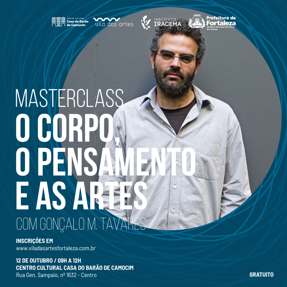 A Vila das Artes abre inscrições para a masterclass gratuita “O corpo, o pensamento e as artes”, com o escritor português Gonçalo M. Tavares. O evento ocorrerá no sábado (12/10), das 9h às 12h, no Centro Cultural Casa do Barão de Camocim. Inscrições devem ser realizadas online até 11/10. São ofertadas 80 vagas, a serem preenchidas por ordem de inscrição.