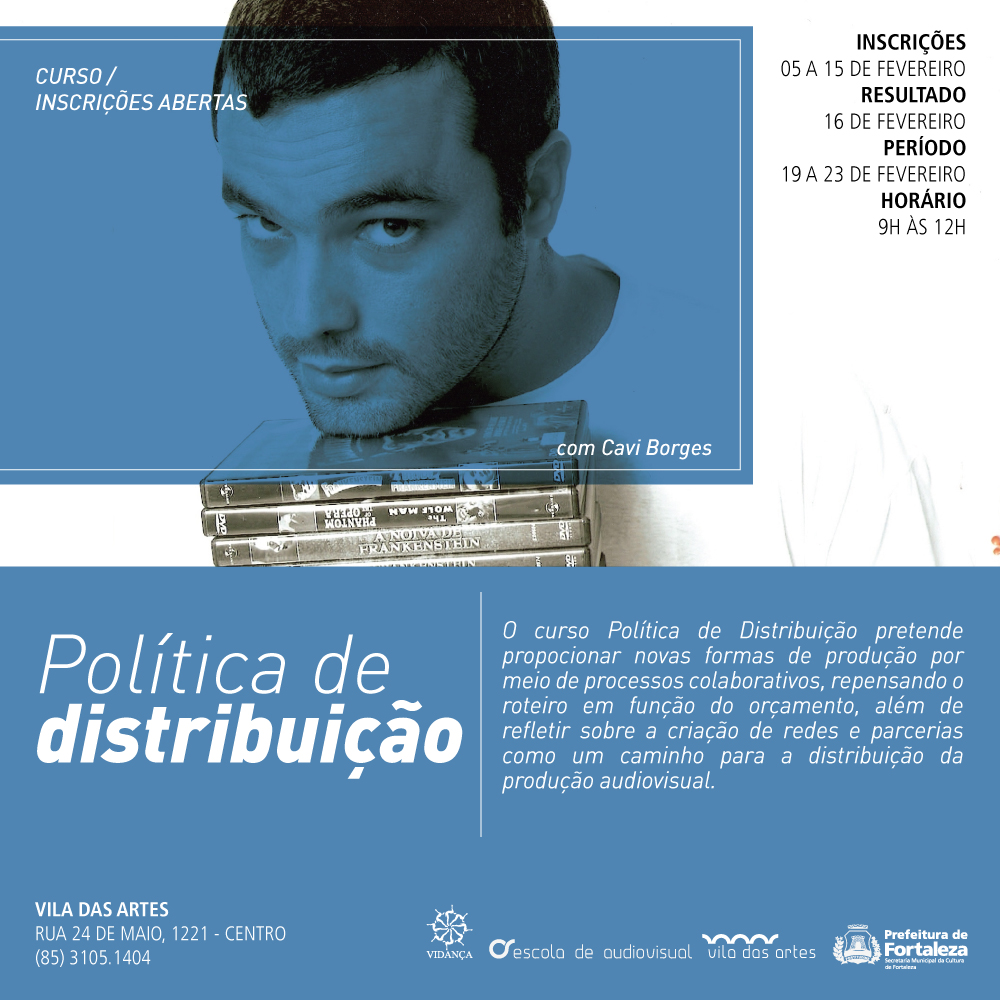 A Escola Pública de Audiovisual da Vila das Artes lança, nesta segunda-feira (05/02), as inscrições para o curso livre Política de Distribuição, com o realizador carioca Cavi Borges. As inscrições vão até o dia 15 de fevereiro e são destinadas para pessoas maiores de 18 anos. A Vila das Artes é um equipamento da Prefeitura de Fortaleza e todas as suas atividades são gratuitas.