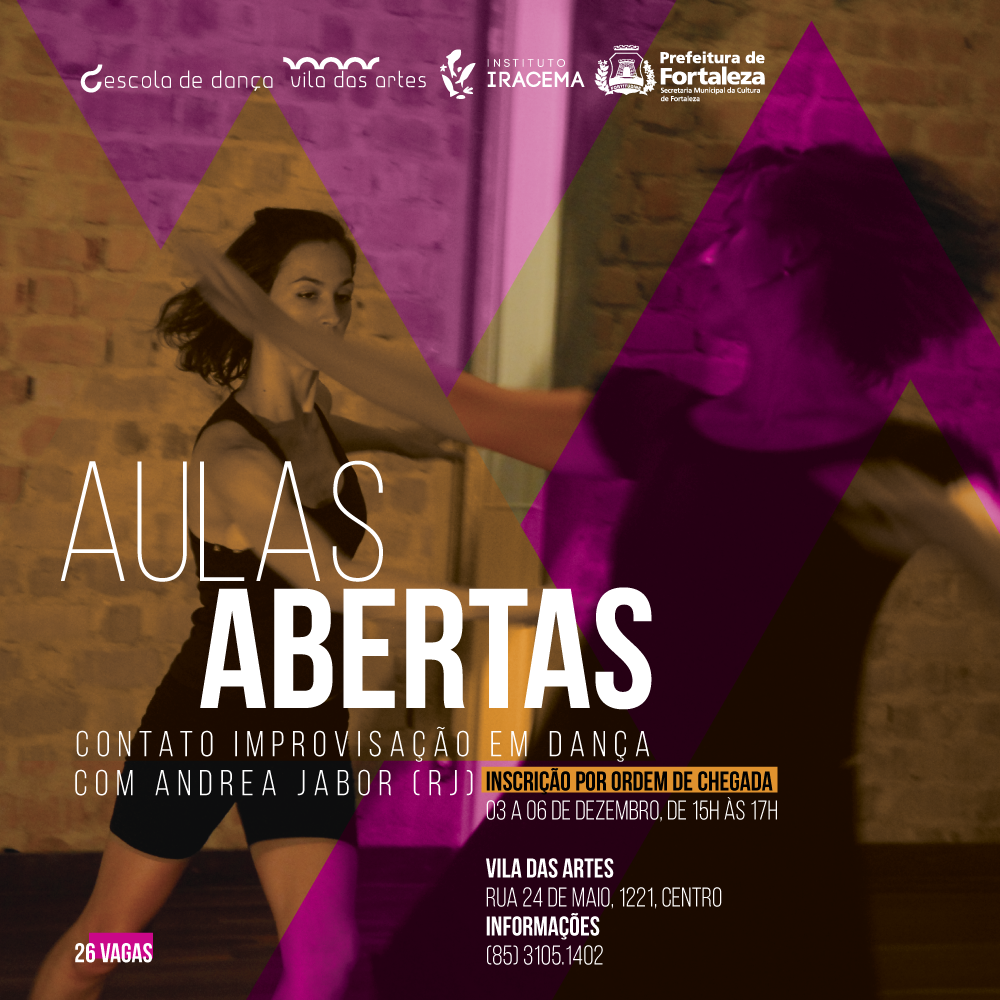 A Escola Pública de Dança da Vila das Artes realiza a oficina gratuita e aberta ao público “Contato Improvisação em Dança”, com a bailarina e acadêmica carioca Andrea Jabor. A oficina faz parte do programa Aulas Abertas, que tem o objetivo de promover aulas gratuitas com professores de dança renomados nacionalmente e internacionalmente. A Vila das Artes é um equipamento da Prefeitura de Fortaleza, coordenado pela Secretaria Municipal da Cultura de Fortaleza (Secultfor).